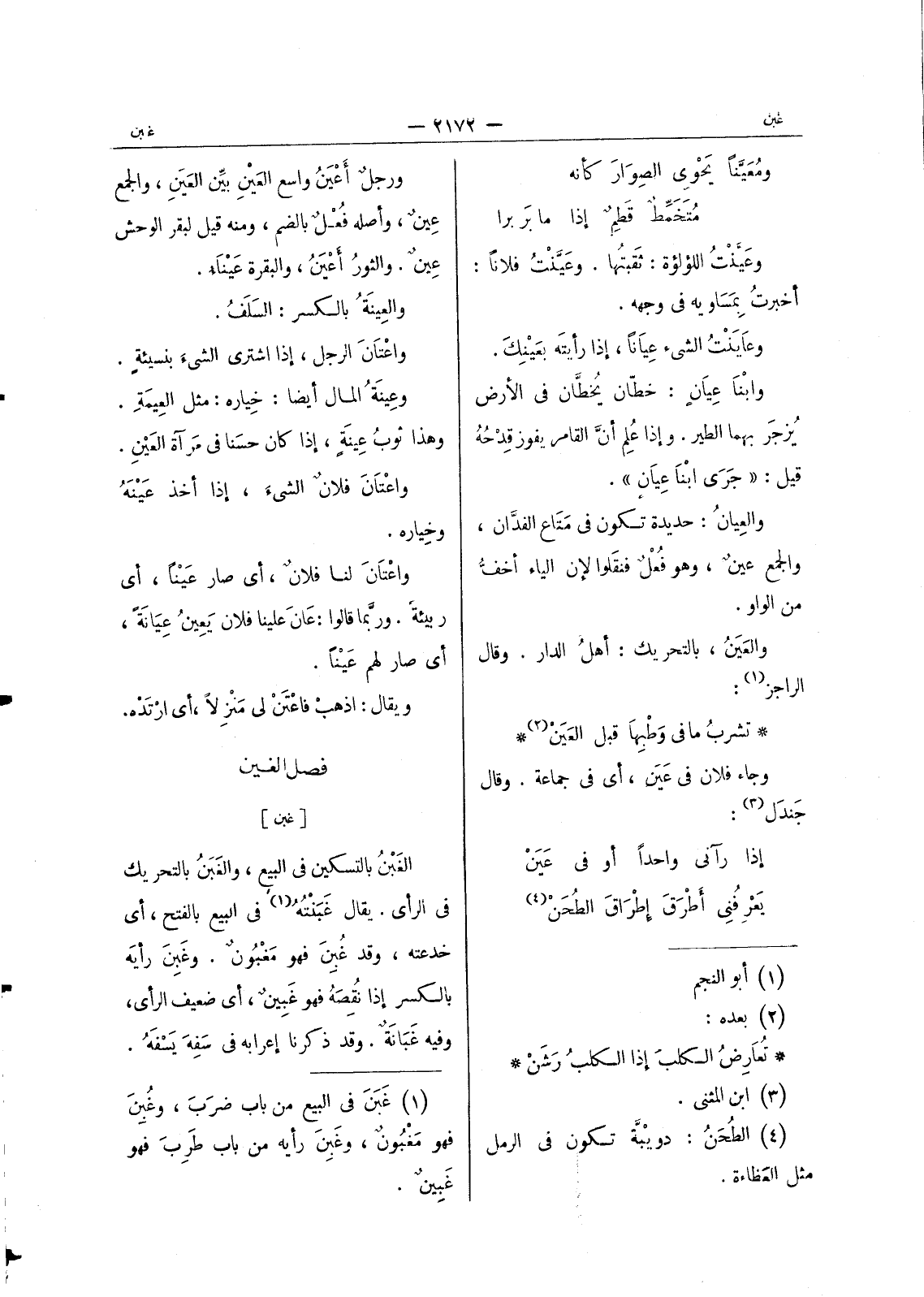 (*) ورجل أعين واسع العين بيِّن العَيَنِ، والجمع عينٌ، وأصله فُعْلٌ بالضم، ومنه قيل لبقر الوحش عينٌ. والثور أعْيَنُ، والبقرة عَيْناءُ. والعينةُ بالكسر: السَلَفُ. واعْتانَ الرجل، إذا اشترى الشئ بنسيئة. وعينَةُ المال أيضاً: خِياره: مثل العيمَةِ. وهذا ثوبُ عِينَةٍ، إذا كان حسَناً في مَرآة العَيْنِ. واعتان فلان الشئ، إذا أخذ عينه وخياره. واعتان فلان، أي صارَ عَيْناً، أي ربيئة. وربَّما قالوا: عانَ علينا فلان يَعينُ عِيانَةً، أي صار لهم عَيْناً. ويقال: اذهبْ فاعْتَنْ لي منزلا، أي ارتده.