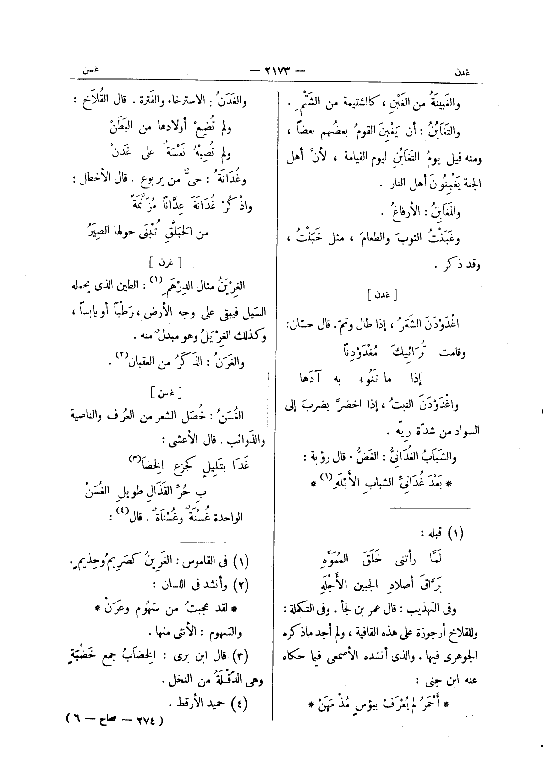 [غدن] اغْدَوْدَنَ الشعر، إذا طال وتمّ. قال حسَّان: وقامتْ تُرائِيكَ مُغْدَوْدِناً * إذا ما تَنُوءُ به آدَها واغْدَوْدَنَ النبتُ، إذا اخضرَّ يضربُ إلى السواد من شدَّة ريه. والشباب الغدانى: الغض. قال رؤبة: