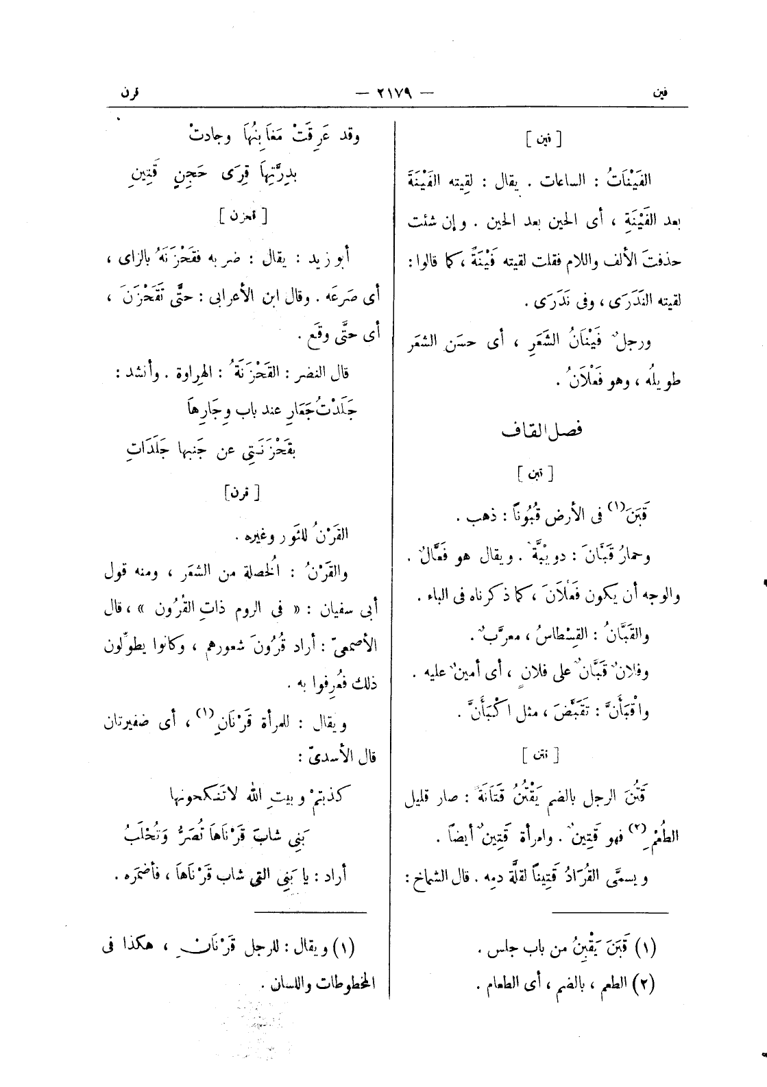 [قرن] القَرْنُ للثَور وغيره. والقَرْنُ: الخصلة من الشعر، ومنه قول أبى سفيان: " في الروم ذات القرون "، قال الاصمعي: أراد قرون شعورهم، وكانوا يطولون ذلك فعرفوا به. ويقال: للمرأة قرنان (¬1) ، أي ضفيرتان قال الاسدي: كذبتم وبيت الله لا تنكحونها * بنى شاب قرناها تصر وتحلب أراد: يا بنى التى شاب قرناها، فأضمره.