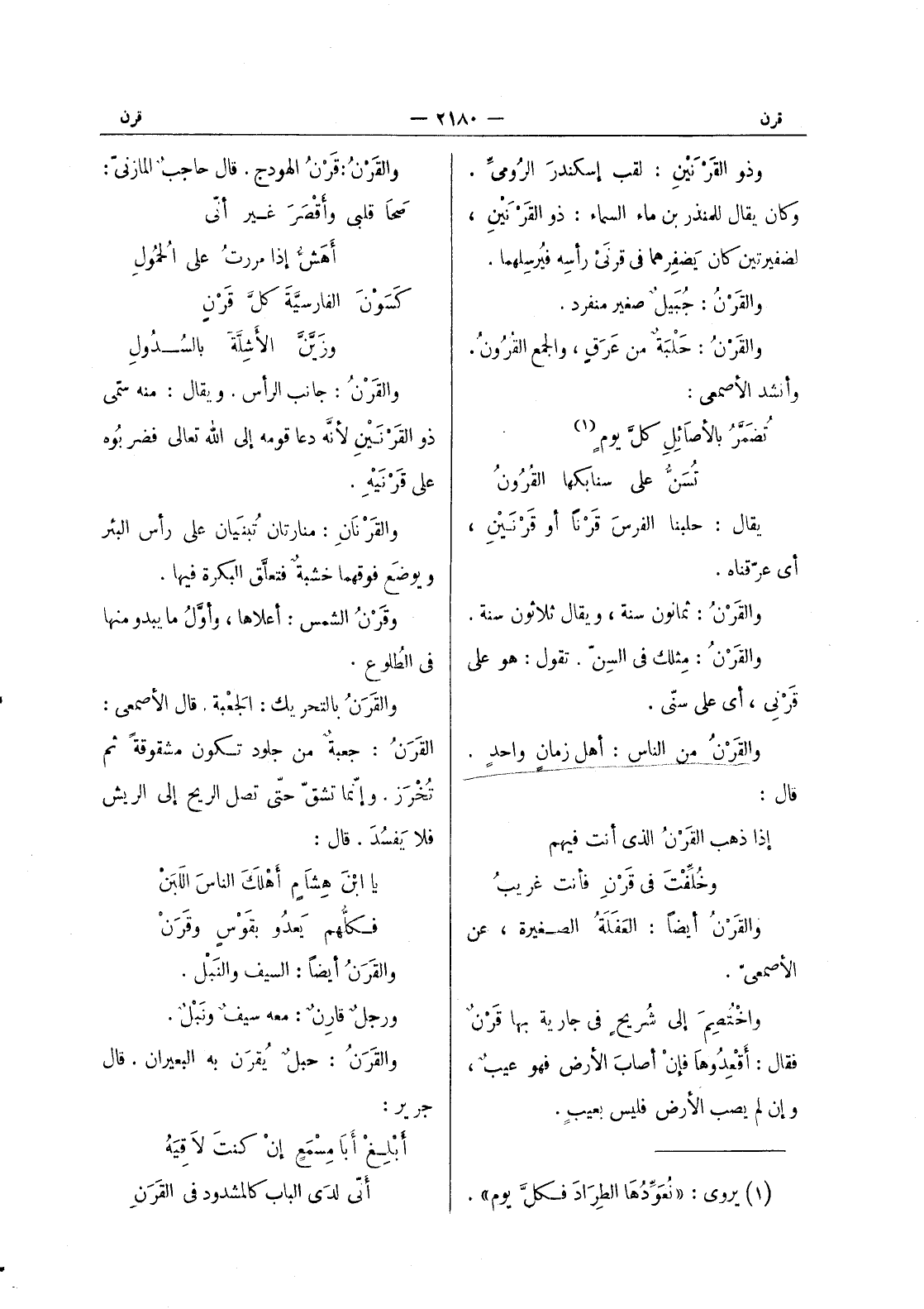 (*) والقَرْنُ: قَرْنُ الهودج. قال حاجبٌ المازنيّ: صَحا قلبي وأقْصَرَ غير أنّي * أهَشُّ إذا مررتُ على الحُمولِ كَسَوْنَ الفارسيَّةَ كلَّ قَرْنٍ * وزَيَّنَّ الأشلَّةَ بالسُدولِ والقَرْنُ: جانب الرأس. ويقال: منه سمّي ذو القَرْنَيْنِ لأنَّه دعا قومه إلى الله تعالى فضربوه على قَرْنَيْهِ. والقَرْنانِ: منارتان تُبنَيان على رأس البئر ويوضع فوقهما خشبةٌ فتعلَّق البكرة فيها. وقَرْنُ الشمس: أعلاها، وأوَل ما يبدو منها في الطلوع. والقرن بالتحريك: الجعبة. قال الاصمعي: القرن: جعبة من جلود تكون مشقوقة ثم تخرز. وإنما تشق حتى تصل الريح إلى الريش فلا يفسد. قال: يا ابن هشام أهلك الناس اللبن * فكلهم يعدو بقوس وقرن والقرن أيضاً: السيف والنَبل. ورجلٌ قارِنٌ: معه سيفٌ ونَبْلٌ. والقَرَنُ: حبلٌ يقرَن به البعيران. قال جرير: أبْلِغْ أبا مِسْمَعٍ إن كنتَ لاقيَهُ * أنّي لدى الباب كالمشدود في القرن