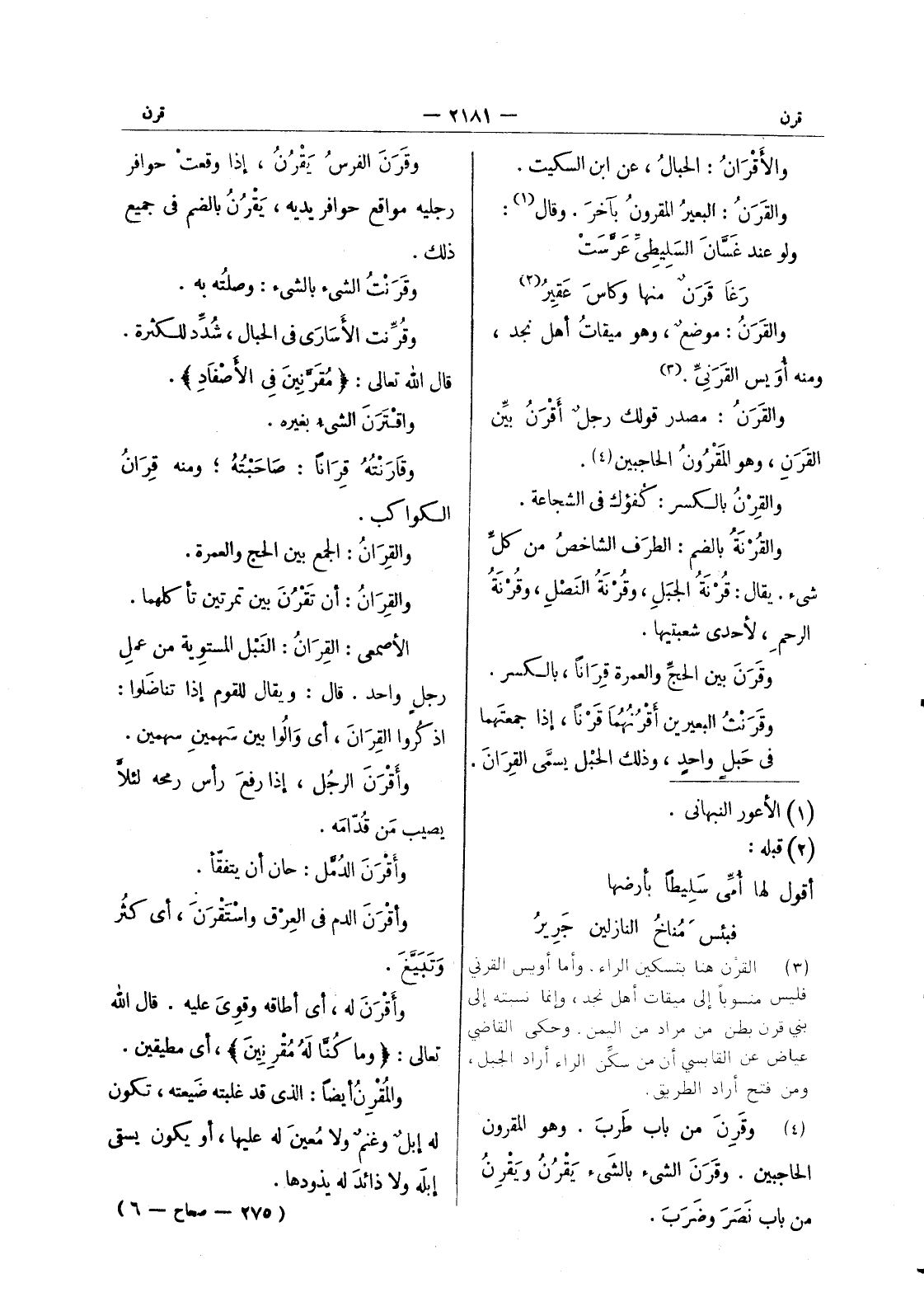 (*) وقرن الفرس يقرن، إذا وقعت حوافر رجليه مواقع حوافر يديه، يَقْرُنُ بالضم في جميع ذلك. وقرنت الشئ بالشئ: وصلته به. وقُرِّنت الأسارى في الحبال، شُدِّد للكثرة. قال الله تعالى: (مقرنين في الاصفاد) . واقترن الشئ بغيره. وقارَنْتُهُ قِراناً: صاحَبْتُهُ، ومنه قِرانُ الكواكب. والقِرانُ: الجمع بين الحج والعمرة. والقِرانُ: أن تَقْرُنَ بين تمرتين تأكلهما. الأصمعي: القِرانُ: النبل المستوية من عمل رجلٍ واحد. قال: ويقال للقوم إذا تناضلوا: اذكروا القِرانَ، أي والوا بين سهمين سهمين. وأقْرَنَ الرجلُ، إذا رفعَ رأس رمحه لئلاَّ يصيب من قُدّامَهُ. وأقْرَنَ الدُمَّل: حان أن يتفقّأ. وأقْرَنَ الدم في العرق واسْتَقْرَنَ، أي كثُر وتَبَيَّغَ. وأقْرَنَ له، أي أطاقه وقوِيَ عليه. قال الله تعالى: (وما كُنَّا له مُقْرنين) ، أي مطيقين. والمُقْرِنُ أيضا: الذى غلبته ضيعته، تكون له إبلٌ وغنمٌ ولا مُعين له عليها، أو يكون يسقي إبله ولا ذائد له يذودها.
