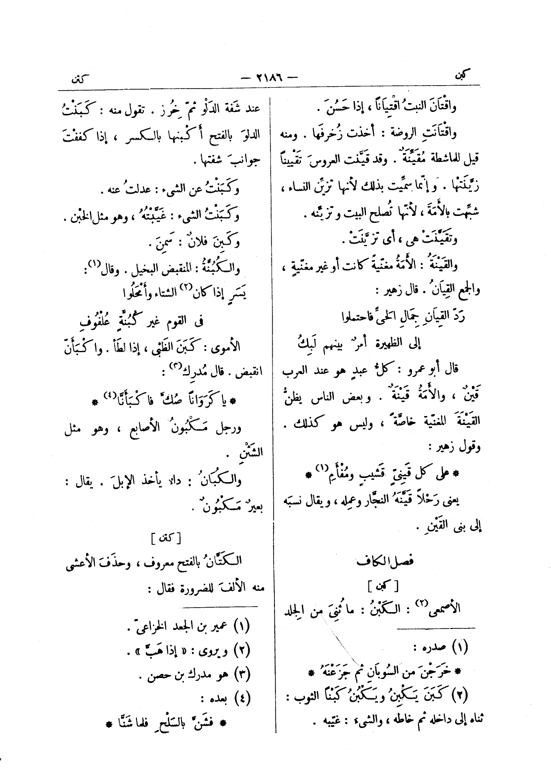 (*) عند شفة الدلو ثمَّ خُرز. تقول منه: كَبَنْتُ الدلوَ بالفتح أكْبنها بالكسر، إذا كففتَ جوانبَ شفتها. وكَبَنْتُ عن الشئ: عدلت عنه. وكبنت الشئ: غَيَّبْتُهُ، وهو مثل الخبْن. وكَبِنَ فلانٌ: سَمِنَ. والكُبُنَّةُ: المنقبض البخيل. وقال (¬1) : يسر إذا كان (¬2) الشتاء وأمحلوا * في القوم غير كبنة علفوف الأمويّ: كَبَنَ الظبي، إذا لطَأ. واكبأن انقبض. قال مدرك (¬3) :