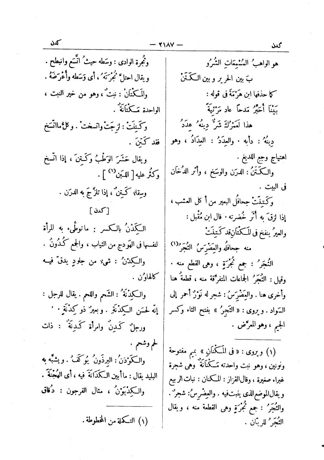 (*) وثجرة الوادي: وسطه حيث اتسع وانبطح. ويقال احتل ثجرته، أي وسطه وأعرضه. والمكتان: نبت، وهو من خير النبت، الواحدة مُكْتانَةٌ. وكَتِنَتْ: لزِجَت واتسخت. وكلُّ ما اتسخَ فقد كَتِنَ. ويقال حَشَرَ الوَطْبُ وكَتِنَ، إذا اتّسخ وكثُر عليه [اللبن (¬1) ] . وسقاءٌ كَتِنٌ، إذا تلزج به الدرن.