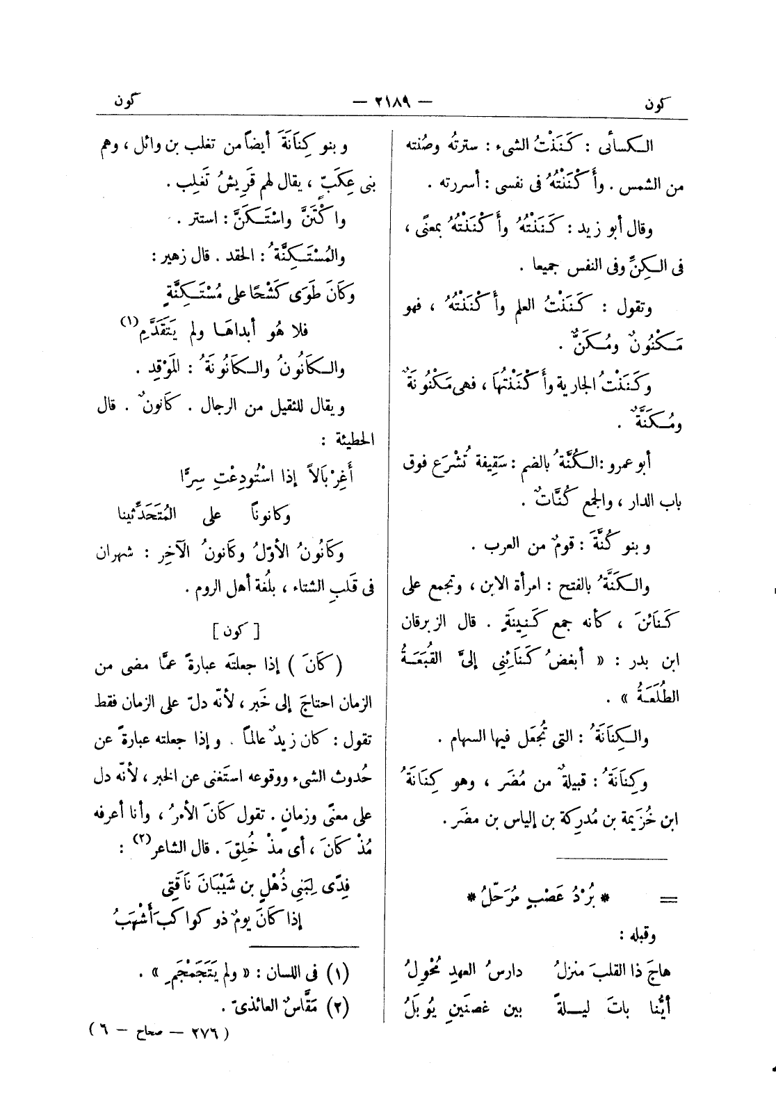 وبنو كنانة أيضا من تغلب بن وائل، وهم بنى عكب، يقال لهم قريش تغلب. واكْتَنَّ واسْتَكَنَّ: استتر. والمُسْتَكِنَّةُ: الحقد. قال زهير: وكانَ طَوى كَشْحاً على مُسْتَكِنَّةٍ * فلا هُو أبداها ولم يَتَقَدَّمِ (¬1) والكانونُ والكانونَةُ: المَوْقِد. ويقال للثقيل من الرجال. كانونٌ. قال الحطيئة: أغر بالا إذا استودعت سِرًّا * وكانوناً على المُتَحَدِّثينا وكانونُ الأوَّلُ وكانونُ الآخِر: شهران في قلب الشتاء، بلُغة أهل الروم.