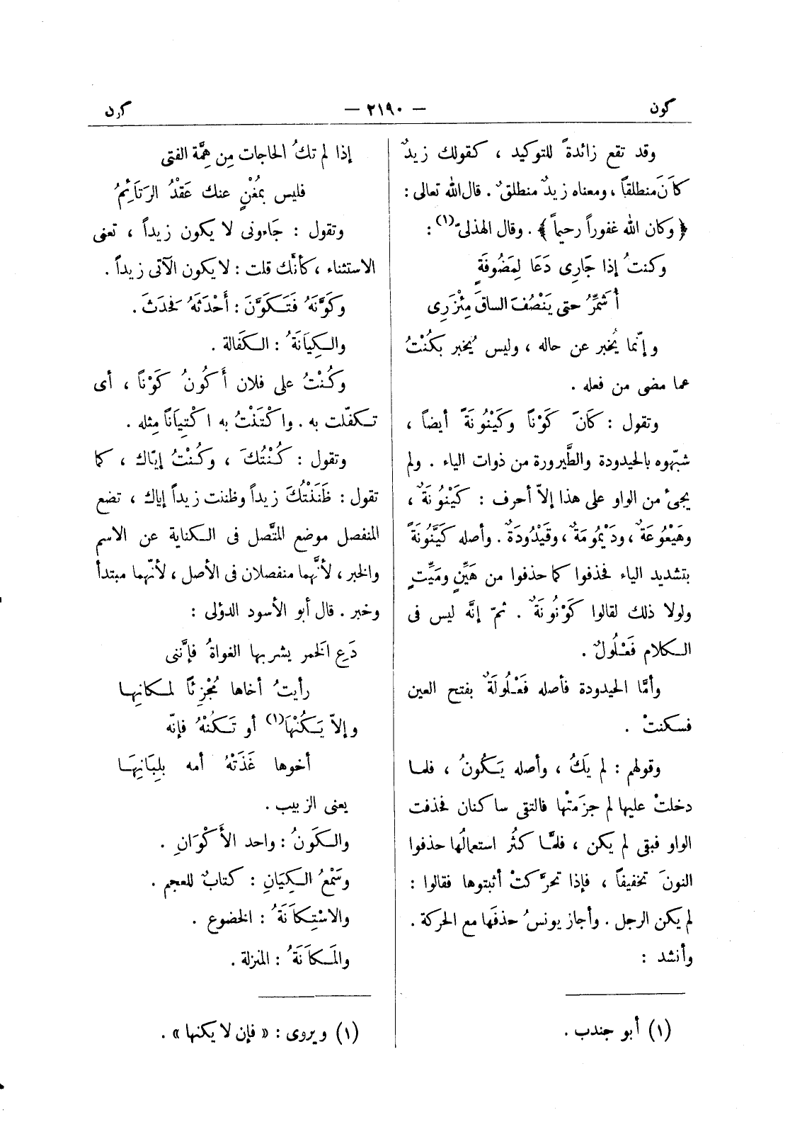 (*) إذا لم تك الحاجاتِ من هِمَّة الفتى * فليس بمُغْنٍ عنك عَقْدُ الرَتائِمِ وتقول: جاء ونى لا يكون زيدا، تعنى الاستثناء، كأنَّك قلت: لا يكون الآتي زيداً. وكَوَّنَهُ فَتَكَوَّنَ: أحْدَثَهُ فحَدَثَ. والكِيانَةُ: الكَفالة. وكنتُ على فلان أكون كونا، أي تكفلت به. واكْتَنْتُ به اكْتِياناً مِثله. وتقول: كُنْتُكَ، وكنتُ إيَّاكَ، كما تقول: ظننتُكَ زيداً وظننت زيداً إيَّاكَ، تضع المنفصل موضع المتَّصل في الكناية عن الاسم والخبر، لأنَّهما منفصلان في الأصل، لأنَّهما مبتدأ وخبر. قال أبو الاسود الدؤلى: دَعِ الخمرَ يشربها الغواةُ فإنَّني * رأيتُ أخاها مُجْزِئاً لمكانِها وإلاّ يَكُنْها (¬1) أو تَكُنْهُ فإنَّه * أخوها غَذَتْهُ أمُّه بلِبانِها يعني الزبيب. والكون: واحد الاكوان. وسمع الكيان: كتاب للعجم. والاستكانة: الخضوع. والمكانة: المنزلة.
