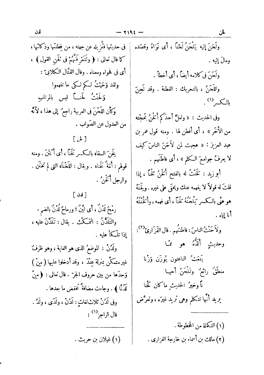 ولحن إليه يلحن لحنا، أي نَواهُ وقصَده ومالَ إليه. ولَحَنَ في كلامه أيضاً، أي أخطأ. واللحن، بالتحريك: الفطنة. وقد لحن بالكسر (¬1) . وفي الحديث: " ولعلَّ أحدَكم ألْحَنُ بحُجَّته من الآخر "، أي أفطن لها. ومنه قول عمر بن عبد العزير: " عجبت لمن لاحن الناس كيف لا يعرفُ جوامعَ الكلم "، أي فاطَنَهم. أبو زيد: لَحَنْتُ له بالفتح ألْحَنُ لَحْناً، إذا قلت له قولاً لا يفهمه عنك ويخفى على غيره. ولحنه هو عنى بالكسر يلحنه لحنا، أي فهمه، وألْحَنْتُهُ أنا إيَّاه. ولاحنت الناس: فاطنهم. قال الفزارى (¬2) : وحديثٍ ألَذُّهُ هو ممَّا * يَنْعَتُ الناعتون يوزَن وَزْنا منطَقٌ رائعٌ وتَلْحَنُ أحيا * ناً وخيرُ الحديثِ ما كان لَحْنا يريد أنَّها تتكلَّم وهي تريد غيره، وتعرِّض