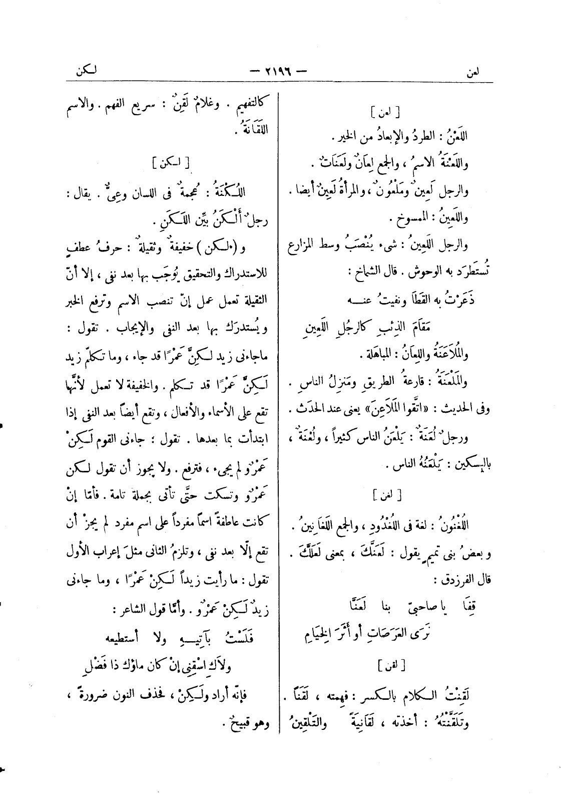 [لكن] اللُكْنَةُ: عُجمةٌ في اللسان وعِيٌّ. يقال: رجلٌ ألْكَنُ بيِّن اللكن. و (لكن) خفيفة وثقيلة: حف عطفٍ للاستدراك والتحقيق يوجَب بها بعد نفي، إلا أن الثقيلة تعمل عمل إنّ تنصب الاسم وترفع الخبر ويُستدرَك بها بعد النفي والإيجاب. تقول: ما جاءني زيد لكِنَّ عَمراً قد جاء، وما تكلم زيد لَكِنَّ عَمْراً قد تكلم. والخفيفة لا تعمل لأنها تقع على الأسماء والأفعال، وتقع أيضاً بعد النفي إذا ابتدأت بما بعدها. تقول: جاءني القوم لَكِنْ عَمْرٌو لم يجئ، فترفع. ولا يجوز أن تقول لكن عمرٌو وتسكت حتَّى تأتي بجملة تامة. فأما إن كانت عاطفةً اسماً مفرداً على اسم مفرد لم يجز أن تقع إلا بعد نفي، وتلزمُ الثاني مثلَ إعراب الأول تقول: ما رأيت زيداً لَكِنْ عَمرأ، وما جاءني زيدٌ لَكِنْ عَمرٌو. وأما قول الشاعر: فَلَسْتُ بآتيهِ ولا أستطيعه * ولاكِ اسْقِني إن كان ماؤكَ ذا فَضلِ فإنّه أراد ولَكِنْ، فحذف النون ضرورةً، وهو قبيح.