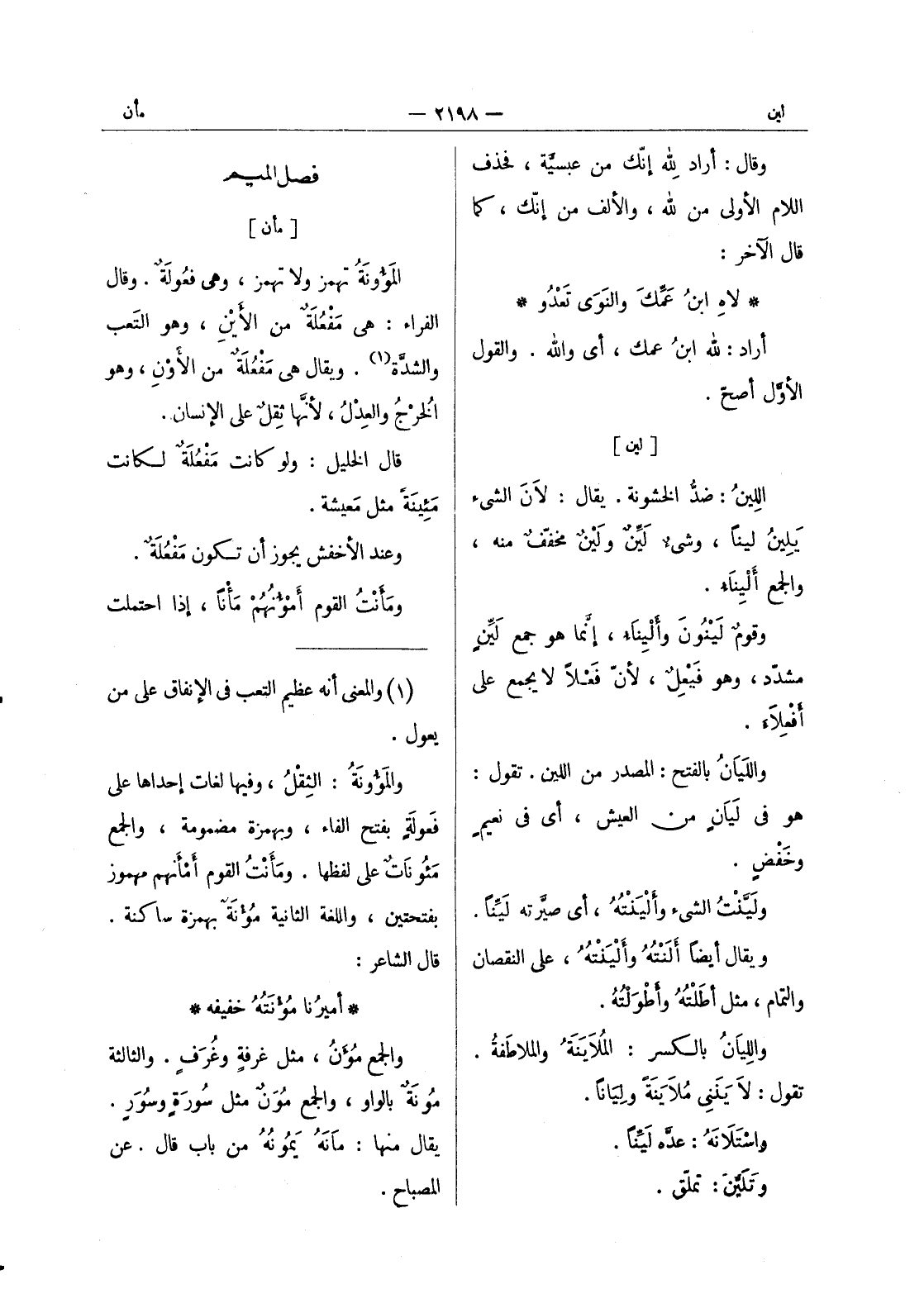 [مأن] المَؤُونَةُ تهمز ولا تهمز، وهي فعولةٌ. وقال الفراء: هي مفعلة من الاين، هو التعب والشدَّة (¬1) . ويقال هي مَفْعُلَةٌ من الأَوْنِ، وهو الخُرجُ والعِدْلُ، لأنَّها ثقل على الانسان. قال الخليل: ولو كانت مفعلة لكانت مئينة مثل معيشة. وعند الاخفش يجوز أن تكون مفعلة. ومأنت القوم أمؤنهم مأنا إذا احتملت
