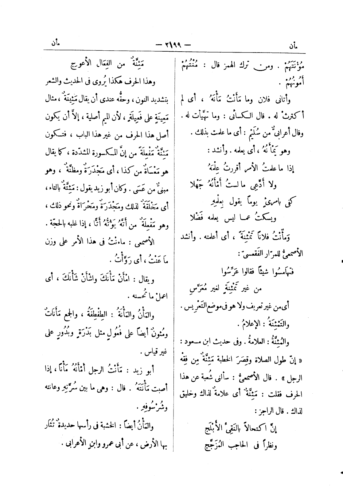 مؤنتهم. ومن ترك الهمز قال: مُنْتُهُمْ أمونُهُمْ. وأتاني فلان وما مَأَنْتُ مَأْنَهُ، أي لم أكترث له. قال الكسائي: وما تهَيَّأْت له. وقال أعرابيٌّ من سُلَيْم: أي ما علمت بذلك. وهو يمْأَنُهُ، أي يعلمه. وأنشد: إذا ما علمتُ الأمر أقْرَرْتُ علمه * ولا أدَّعي ما لستُ أمْأَنُهُ جهلا كَفى بامْرئٍ يوماً يقول بعلمِهِ * ويسكتُ عمَّا ليسَ يعلمه فَضْلا ومَأَّنْتُ فلاناً تَمْئِنَةً، أي أعلمته. وأنشد الأصمعي للمرار الفَقعسيّ: فتهامسوا شيئاً فقالوا عَرِّسوا * من غير تَمْئِنَةٍ لغير مُعَرَّسِ أي من غير تعريف ولا هو في موضع التَعْريس. والتَمْئِنَةُ: الإعلامُ. والمُئِنَّةُ: العلامةُ. وفي حديث ابن مسعود: " إنّ طول الصلاة وقِصَرَ الخطبة مَئِنَّةٌ من فِقه الرجل ". قال الأصمعي: سألني شعبة عن هذا الحرف فقلت: مَئِنَّةٌ أي علامةٌ لذاك وخليق لذاك. قال الراجز: إن اكتحالا بالنقى الابلج * ونظرا في الحاجب المزجج