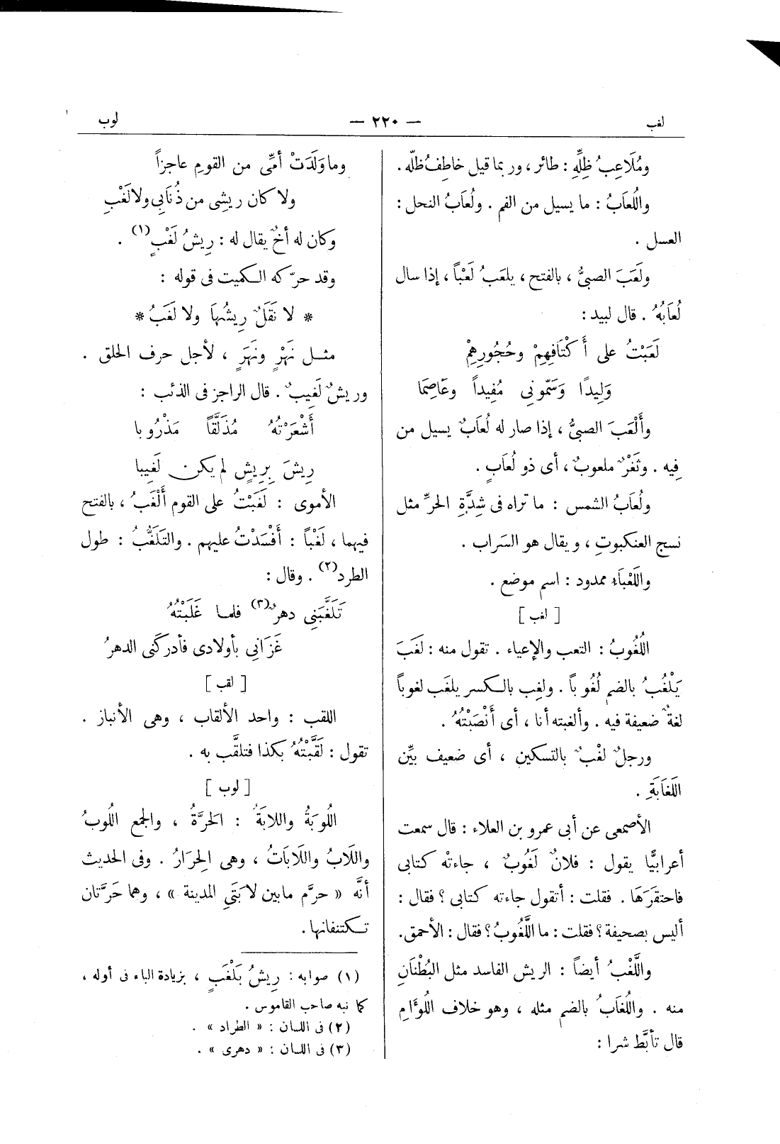 لا نَقَلٌ ريشُها ولا لغب * مثل نهر ونهر، لاجل حرف الحلق وريش لغيب. قال الراجز في الذئب: أشْعَرْتُهُ مُذَلّقاً مَذْروبا * ريشَ بريش لم يكن لَغيبا الأموي: لَغَبْت على القوم ألغَبُ، بالفتح فيهما، لَغْباً: أفسَدتُ عليهم. والتَلَغّبُ: طول الطرد (¬2) . وقال: تَلَغَّبني دهرٌ (¬3) فلما غَلَبْتُهُ * غَزاني بأولادي فأدركني الدهر