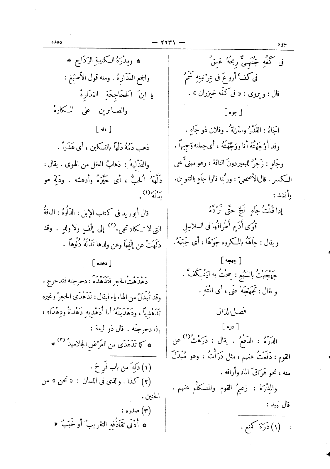 [دهده] دَهْدَهْتُ الحجر فَتَدَهْدَهَ: دحرجته قتدحرج. وقد تبدل من الهاء ياء فيقال: تَدَهْدى الحجرُ وغيره تدهديا، ودهديته أنا أدهديه دهداة ودِهْداءً، إذا دحرجتَه. قال ذو الرمة:
