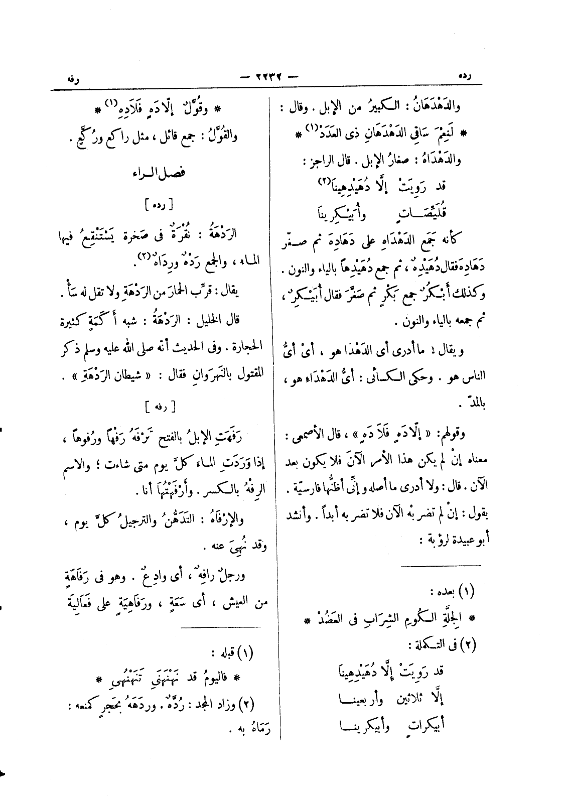 [رده] الرَدْهَةُ: نُقْرَةٌ في صَخْرة يَسْتَنْقِعُ فيها الماءُ، والجمع رَدْهٌ ورداه (¬2) . يقال: قرب الحمار من الرَدْهَةِ ولا تقل له سَأْ. قال الخليل: الردهة: شبه أكمه كثيرة الحجارة. وفى الحديث أنَّه صلى الله عليه وسلم ذكر المقتول بالنهروان فقال: " شيطان الردهة ".