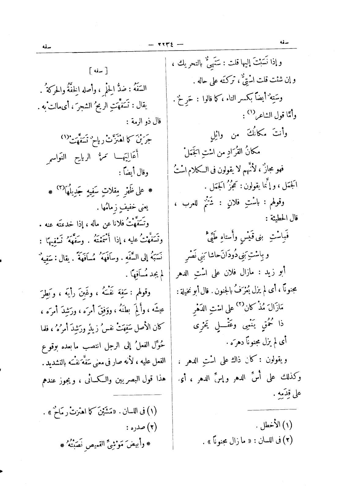 [سفه] السَفَهُ: ضدُّ الحِلمِ، وأصله الخِفَّةُ والحركةُ. يقال: تَسَفَّهَتِ الريحُ الشجرَ، أي مالتْ به. قال ذو الرمة: جَرَيْنَ كما اهْتَزَّتْ رياحٌ تَسَفَّهَتْ (¬1) * أَعالِيَها مَرُّ الرياحِ النواسم وقال أيضا: