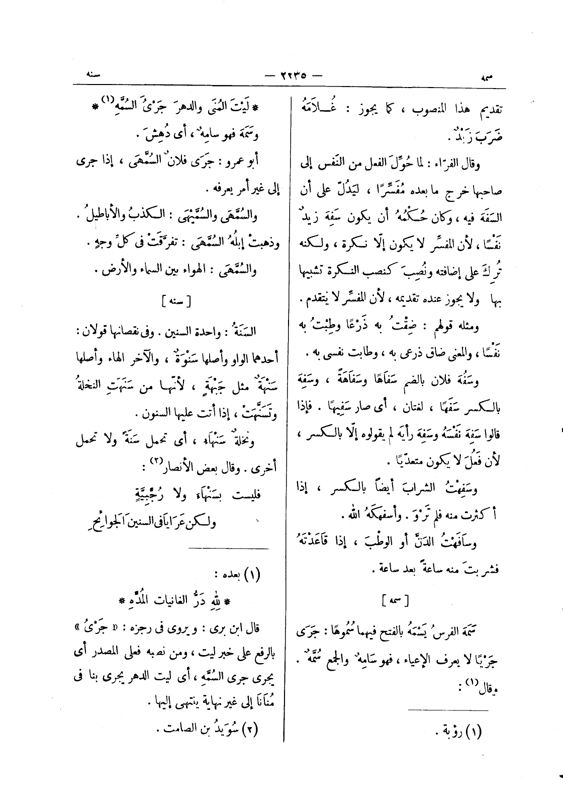 [سنه] السَنَةُ: واحدة السنين. وفي نقصانها قولان: أحدهما الواو وأصلها سَنْوَةٌ، والآخر الهاء وأصلها سَنْهَةٌ مثل جَبْهَةٍ، لأنّها من سَنَهَتِ النخلةُ وتَسَنَّهَتْ، إذا أتت عليها السنون. ونخلةٌ سَنْهاء، أي تحمل سَنَةً ولا تحمل أخرى. وقال بعض الأنصار (¬2) : فليست بسَنْهاَء ولا رُجَّبِيَّةٍ * ولكن عَرايا في السنينِ الجوائح
