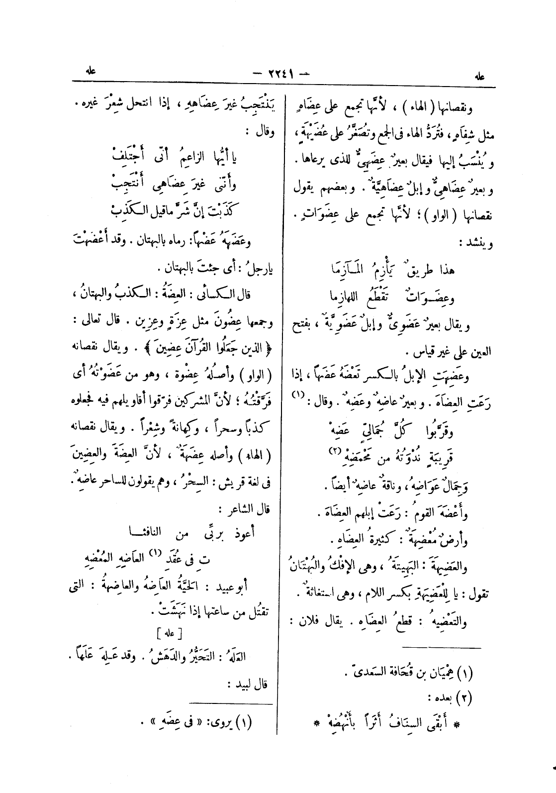 (*) ينتجب غيرَ عِضاهِهِ، إذا انتحل شِعرَ غيره. وقال: يا أيها الزاعم أنى أجتلف * وأنني غير عضاهى أنتجب * كذبت إن شر ما قيل الكذب وعضهه عضها: رماه بالبهتان. وقد أعْضَهْتَ يا رجلُ: أي جئت بالبهتان. قال الكسائي: العِضَةُ: الكذب والبهتان، وجمعها عضون من عزة وعزين. قال تعالى: (الذين جَعَلوا القُرآنَ عِضينَ) . ويقال نقصانه (الواو) وأصلُهُ عِضْوة، وهو من عَضَوْتُهُ أي فرَّقته ; لأن المشركين فرَّقوا أقاويلهم فيه فجعلوه كذباً وسحراً، وكِهانةً وشِعراً. ويقال نقصانه (الهاء) وأصله عِضَهَةٌ، لان العضة والعضين في لغة قريش: السحر، وهو يقولون للساحر عارضة. قال الشاعر: أعوذ بربي من النافثا * ت في عقد (¬1) العاضه المعضه أبو عبيد: الحية العاضِهُ والعاضِهةُ: التي تقتُل من ساعتها إذا نهشت.