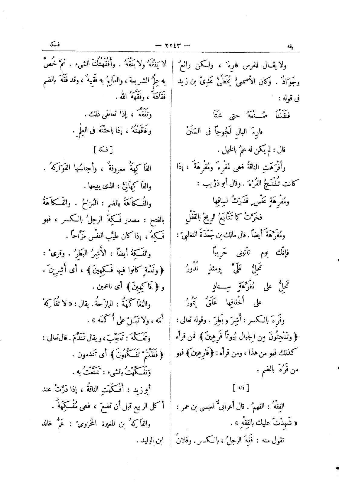 [فكه] الفاكِهَةُ معروفةٌ، وأجناسها الفَواكِهُ. والفاكهاني: الذى يبيعها. والفكاهة بالضم: المُزاحُ. والفَكاهَةُ بالفتح: مصدر فَكِهَ الرجلُ بالكسر، فهو فَكِهٌ، إذا كان طيِّب النفس مَزَّاحاً. والفَكِهُ أيضاً: الأشِرُ البَطِرُ. وقرئ: (ونَعْمةٍ كانوا فيها فَكِهينَ) ، أي أشرين. و (فاكهين) أي ناعمين. والمفاكهة: الممازحة. يقال: " لا تفاكه أمه، ولا تبل على أكمه ". وتفكه: تعجب، ويقال تندم. قال تعالى: (فَظَلْتُمْ تَفَكَّهونَ) أي تندمون. وتفكهت بالشئ: تمتعت به. أبو زيد: أفْكهَتِ الناقة، إذا دَرَّت عند أكل الربيع قبل أن تضع، فهى مفكهة. والفاكه بن المغيرة المخزومى: عم خالد ابن الوليد.