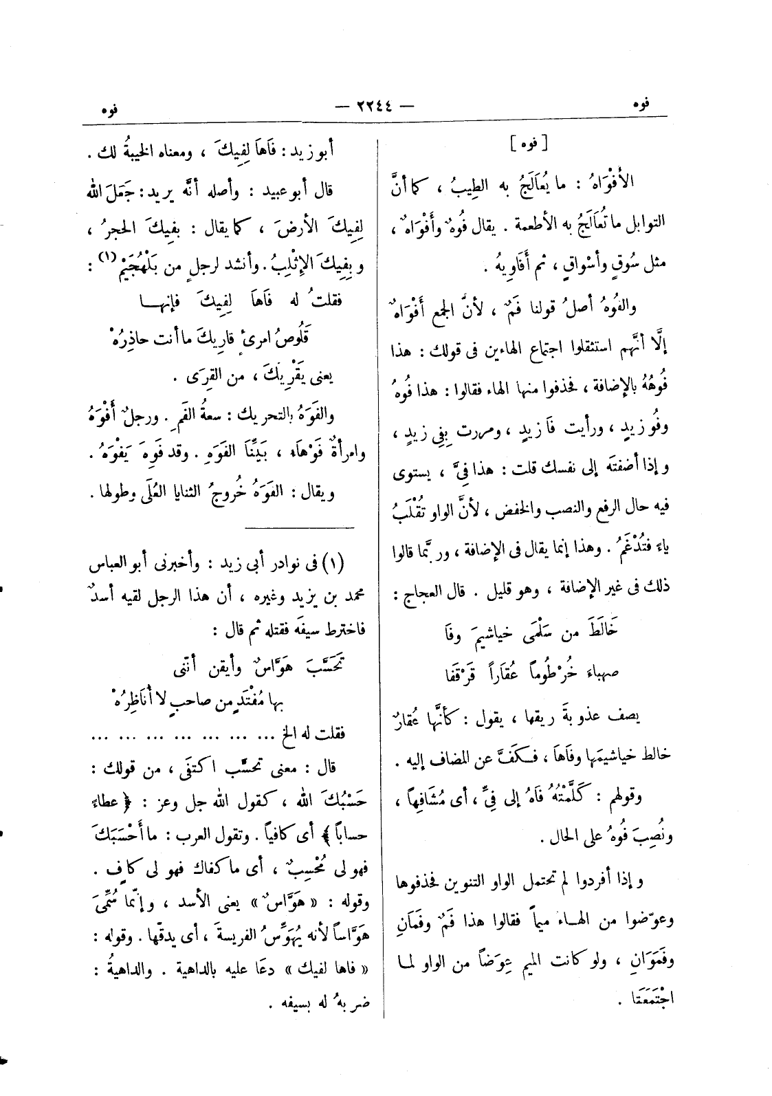 [فوه] الأفْواهُ: ما يُعالَجُ به الطيبُ، كما أنَّ التوابل ما تُعالَجُ به الأطعمة. يقال فوهٌ وأفواه، مثل سوق وأسواق، ثم أفاويه. والفوه أصل قولنا فَمٌ، لأنَّ الجمع أفْواهٌ إلا أنهم استثقلوا اجتماع الهاءين في قولك: هذا فوهُهُ بالإضافة، فحذفوا منها الهاء فقالوا: هذا فوهُ وفو زيدٍ، ورأيت فا زيدٍ، ومررت بفي زيدٍ، وإذا أضفتَه إلى نفسك قلت: هذا فِيَّ، يستوي فيه حال الرفع والنصب والخفض، لأنَّ الواو تُقْلَبُ ياء فتدغم. وهذا إنما يقال في الاضافة، وربما قالوا ذلك في غير الاضافة، وهو قليل. قال العجاج: خالط من سلمى خياشيم وفا * صهباء خرطوما عقارا قرقفا يصف عذوبة ريقها، يقول: كأنها عقار خالط خياشيمها وفاها، فكف عن المضاف إليه. وقولهم: كلمته فاه إلى فِيِّ، أي مُشافِهاً، ونُصب فوهُ على الحال. وإذا أفردوا لم تحتمل الواو التنوين فحذفوها وعوّضوا من الهاء ميماً فقالوا هذا فَمٌ وفَمانِ وفَمَوانِ، ولو كانت الميم عِوَضاً من الواو لما اجتمعتا