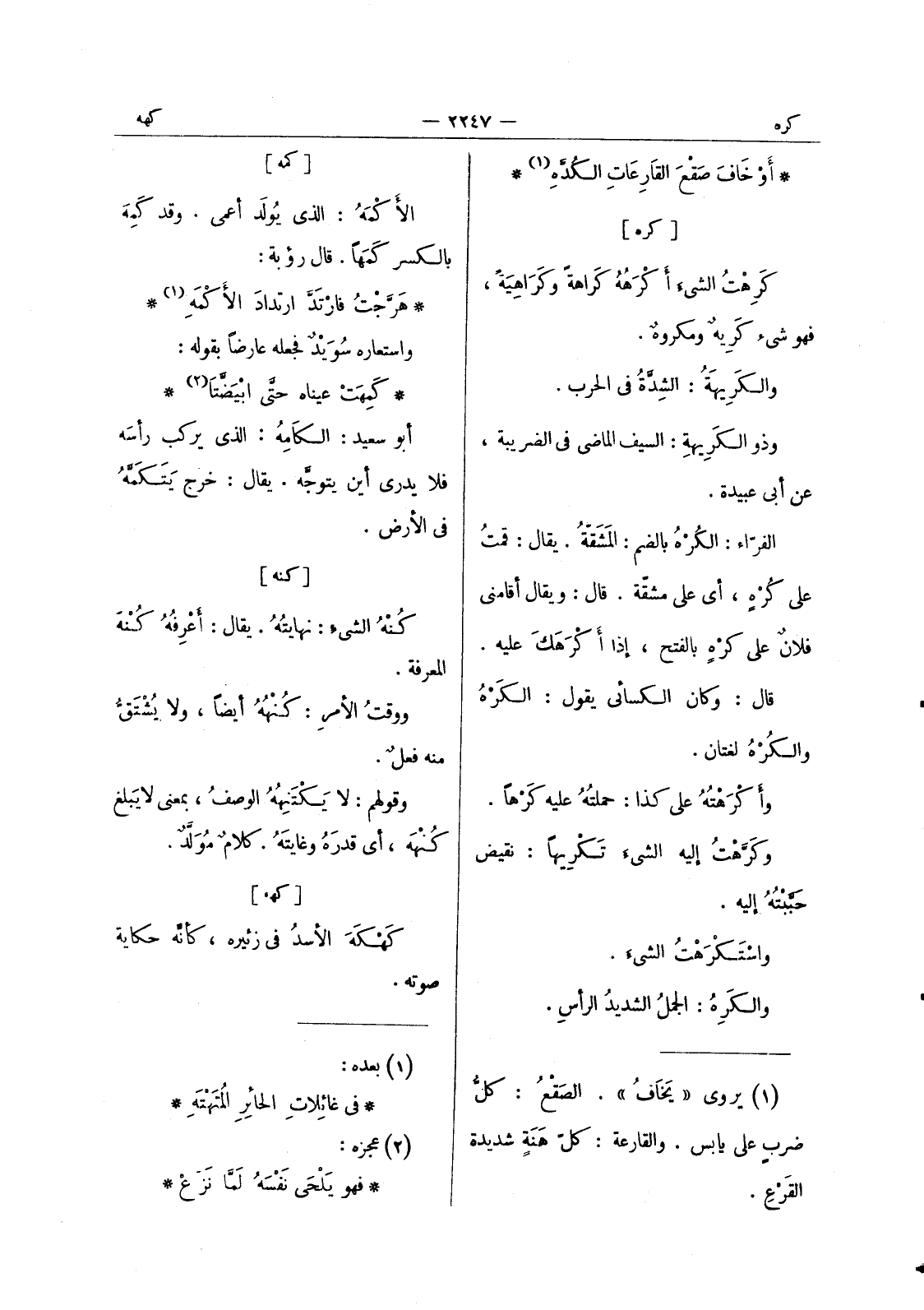 [كره] كرهت الشئ أكرهه كراهة وكراهية، وفهو شئ كريه ومكروه. والكَريهَةُ: الشدَّة في الحرب. وذو الكَريهة: السيف الماضي في الضريبة، عن أبى عبيدة. الفرّاء: الكُرْهُ بالضم: المَشَقَّةُ. يقال: قُمتُ على كُرْهٍ، أي على مشقَّة. قال: ويقال أقامني فلانٌ على كرْهٍ بالفتح، إذا أكْرَهَكَ عليه. قال: وكان الكسائي يقول: الكره والكره لغتان. وأكْرَهْتُهُ على كذا: حملتُهُ عليه كرها. وكرهت إليه الشئ تكريها: نقيض حببته إليه. واستكرهت الشئ. والكره: الجمل الشديد الرأس.