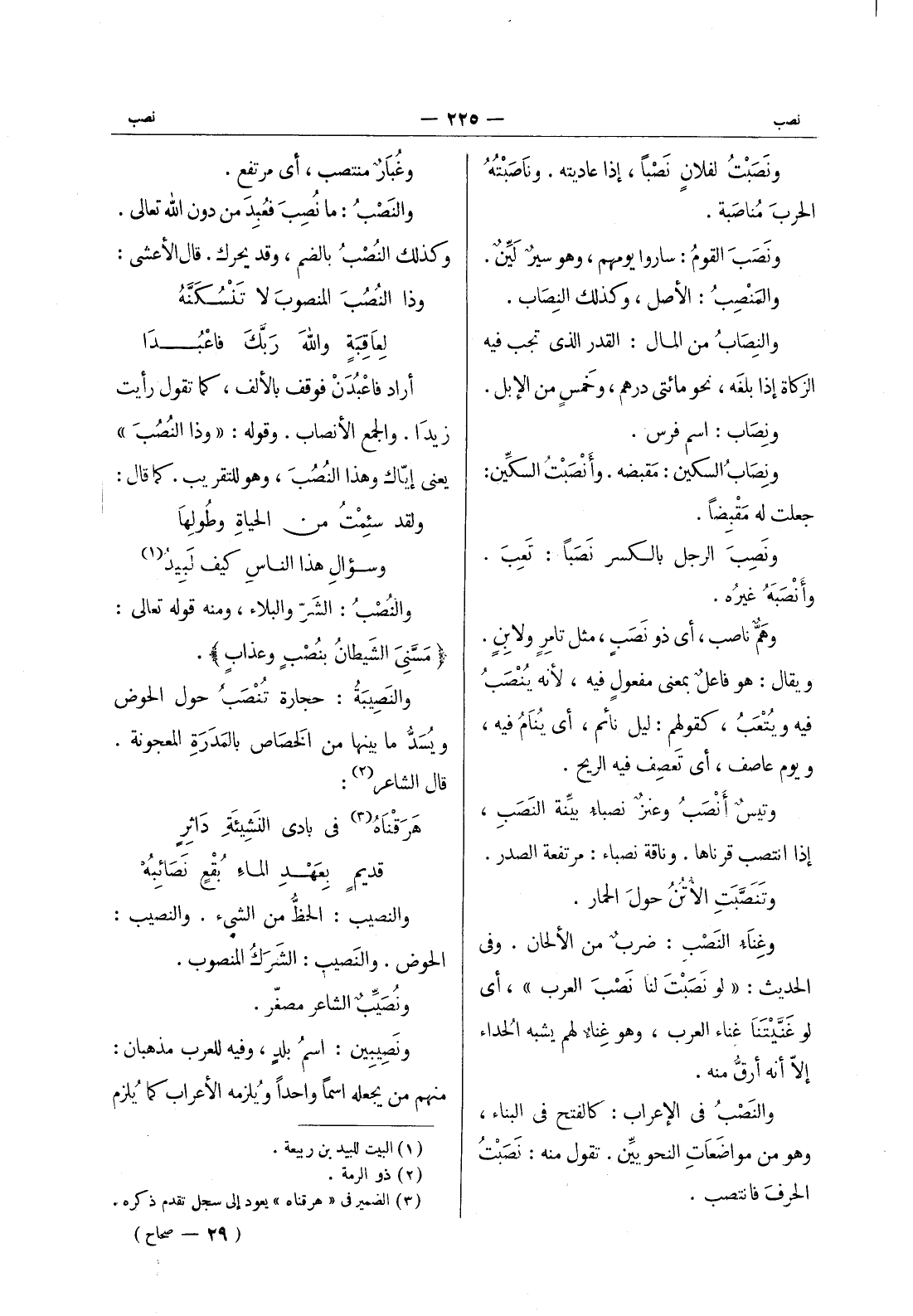 وغبار منتصب، أي مرتفع. والنَصْبُ: ما نُصِبَ فعُبِدَ من دون الله تعالى. وكذلك النُصْبُ بالضم، وقد يُحَرَّك. قال الاعشى: وذا النصب المنصوب لا تنسكنه * لعاقبة والله ربك فاعبدا أراد فاعبدن فوقف بالالف، كما تقول رأيت زيدا. والجمع الانصاب. وقوله: " وذا النصب " يعنى إياك وهذا النصب، وهو للتقريب. كما قال: ولقد سئمت من الحياة وطولها * وسؤال هذا الناس كيف لبيد (¬1) والنُصْبُ: الشرّ والبلاء، ومنه قوله تعالى: (مَسَّنِيَ الشيطانُ بنُصْبٍ وعَذابٍ) . والنَصيبَةُ: حجارة تُنْصَبُ حول الحوض ويُسَدُّ ما بينها من الخَصاص بالمَدَرَةِ المعجونة. قال الشاعر (¬2) : هَرَقْناهُ (¬3) في بادي النَشيئَةِ داثِرٍ * قديمٍ بعهد الماء بُقْعٍ نَصائِبُهْ والنصيب: الحظ من الشئ. والنصيب: الحوض. والنصيب: الشرك المنصوب. ونصيب الشاعر مصغر. ونصيبين: اسم بلد، وفيه للعرب مذهبان: منهم من يجعله اسما واحدا ويلزمه الاعراب كما يلزم