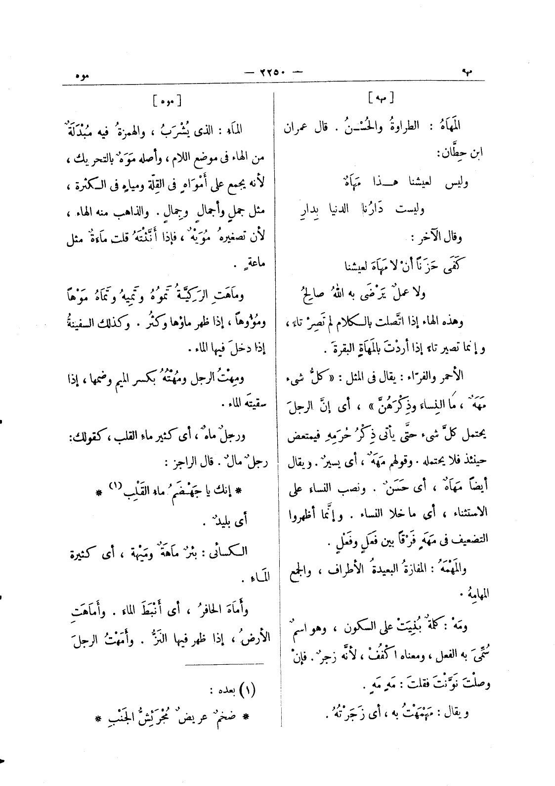 إنَّك يا جَهْضَمُ ماءُ القَلْب (¬1) * أي بليدٌ. الكسائي: بئرٌ ماهَةٌ ومَيْهةٌ، أي كثير الماء. وأماه الحافر، أي أنْبَطَ الماءَ. وأَماهَتِ الأرضُ، إذا ظهر فيها النَزُّ. وأَمَهْتُ الرجلَ