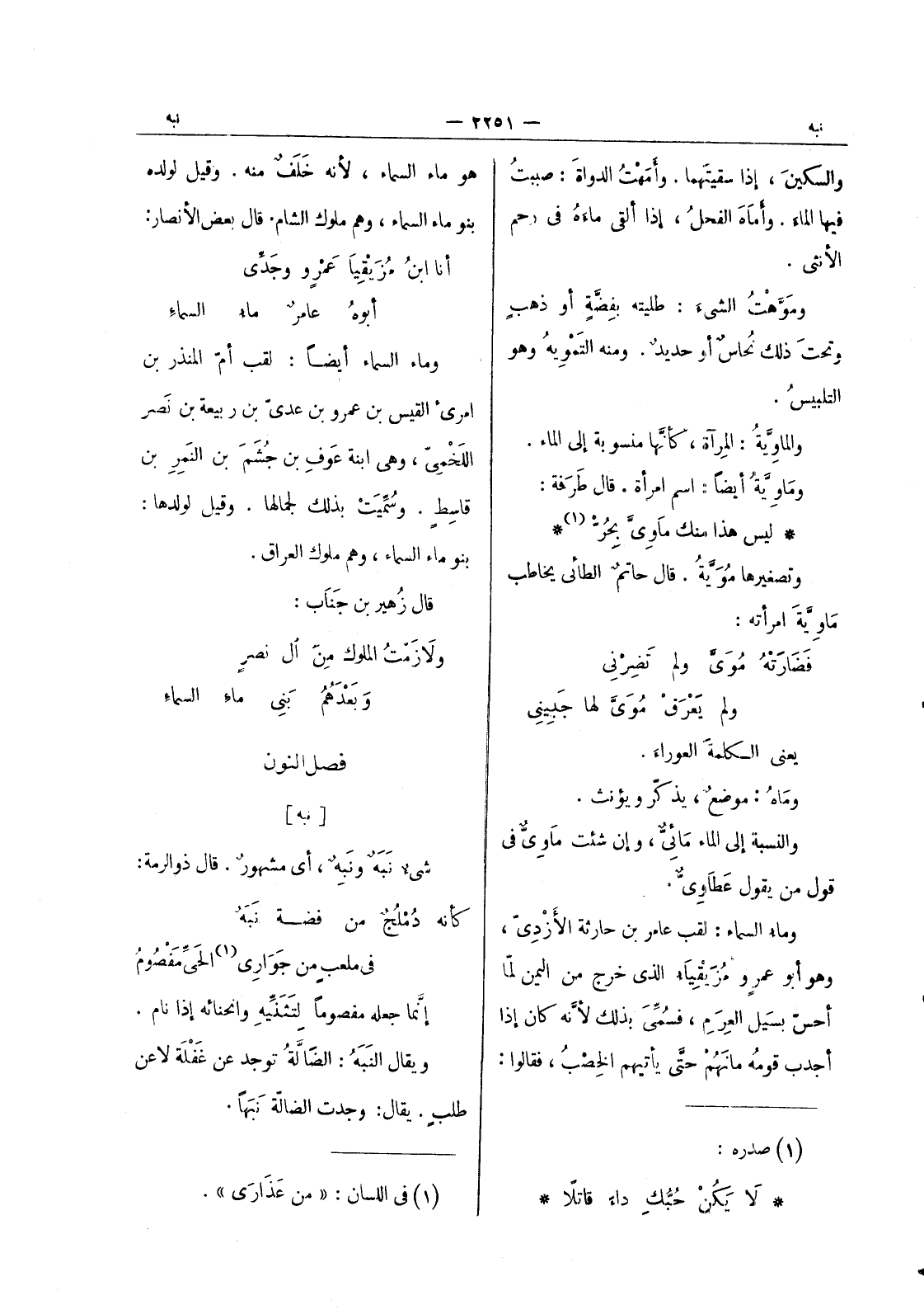 ليس هذا منك ماوى بحر (¬1) * وتصغيرها موية. قال حاتم الطائى يخاطب ماوية امرأته: فضارته موى ولم تضرني * ولم يعرق موى لها جبيني يعنى الكلمة العوراء. وماه: موضع، يذكر ويؤنث. والنسبة إلى الماء مائِيٌّ، وإن شئت ماوى في قول من يقول عطاوى. وماء السماء: لقب عامر بن حارثة الازدي، وهو أبو عمرو مزيقياء الذى خرج من اليمن لما أحس بسيل العرم، فسمى بذلك لانه كان إذا أجدب قومه مانهم حتى يأتيهم الخصب، فقالوا