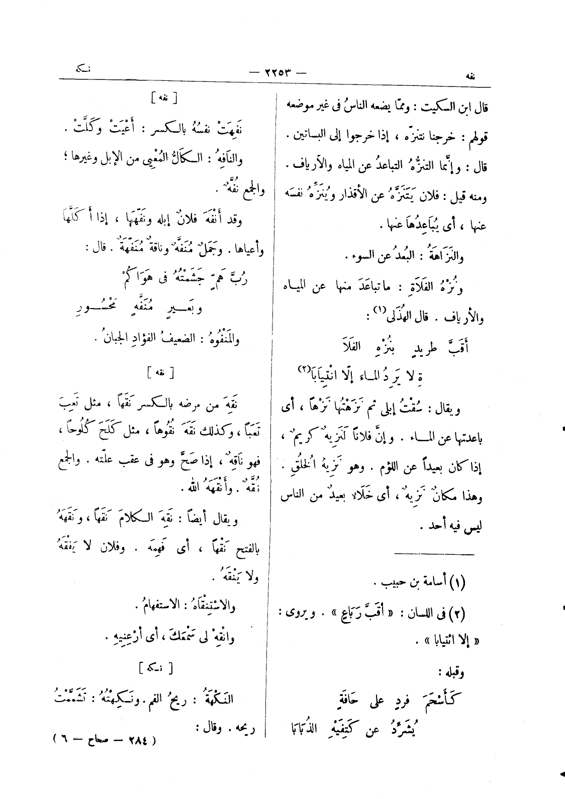 [نفه] نَفِهَتْ نفسُهُ بالكسر: أعيتْ وكلَّتْ. والنافِهُ: الكالُّ المُعْيِي من الإبل وغيرها ; والجمع نُفَّهٌ. وقد أَنفَهَ فلان إبله ونفَّهَها، إذا أكَلَّها وأعياها. وجَمَلٌ مُنَفَّهٌ وناقةٌ مُنَفَّهَةٌ. قال: رُبَّ هَمٍّ جَشَمْتُهُ في هَواكُمْ * وبَعيرٍ مُنَفَّهٍ مَحْسور والمنفوه: الضعيف الفؤاد الجبان.