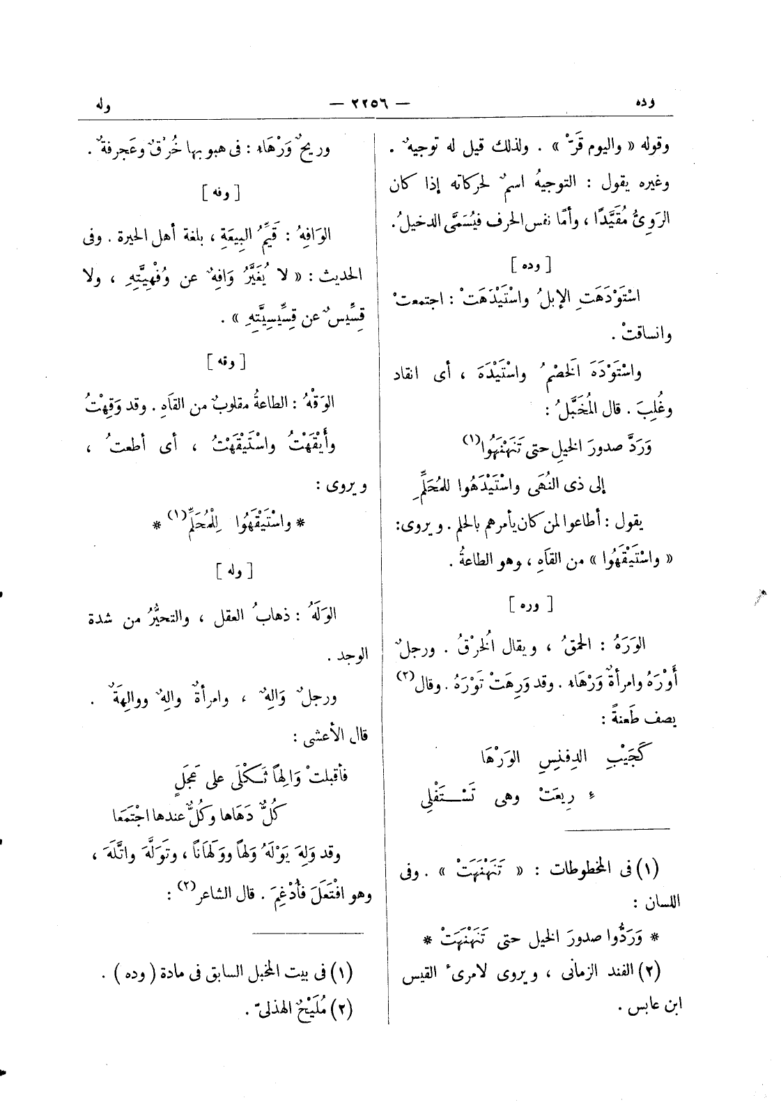 [وده] اسْتَوْدَهَتِ الإبلُ واسْتَيْدَهَتْ: اجتمعتْ وانساقتْ. واسْتَوْدَهَ الخَصْمُ واسْتَيْدَهَ، أي انقاد وغُلِبَ. قال المُخَبَّلُ: ورَدَّ صدورَ الخيلِ حتَّى تَنَهْنَهوا (¬1) * إلى ذي النُهى واسْتَيْدَهوا للمُحَلِّمِ يقول: أطاعوا لمن كان يأمرهم بالحلم. ويروى: " واسْتَيْقَهوا " من القاهِ، وهو الطاعة.