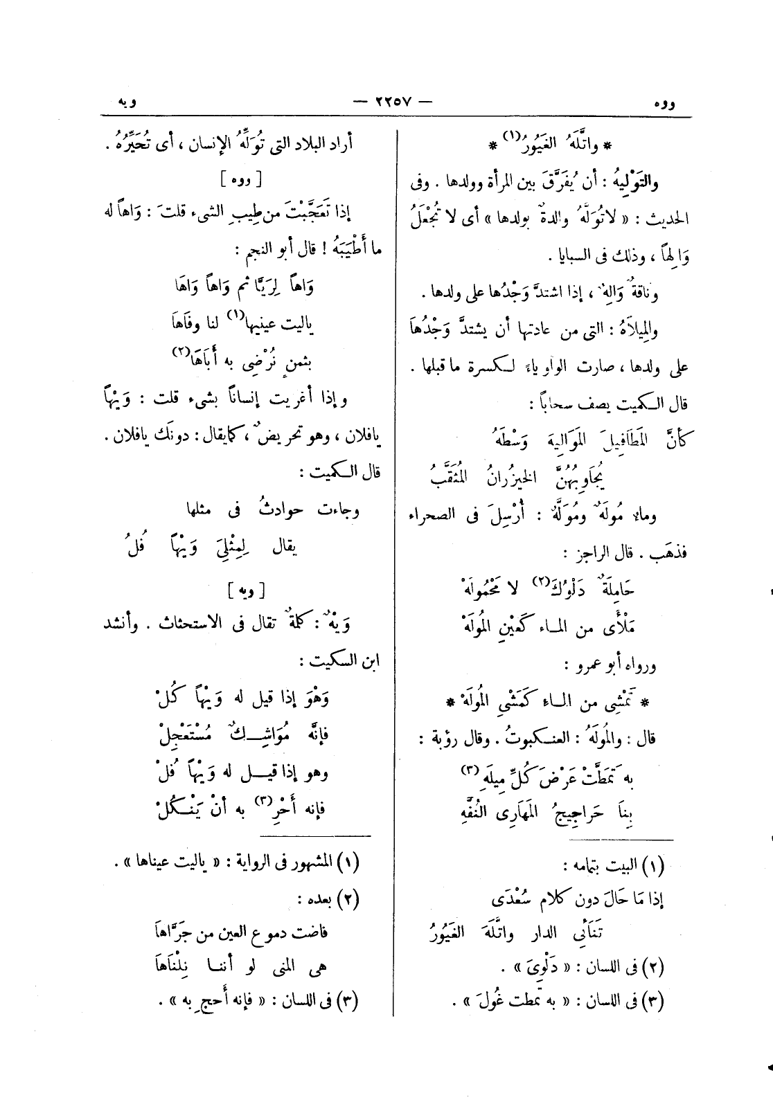 [ووه] إذا تعجَّبْتَ من طيبِ الشئ قلت: واها له ما أطيبه! قال أبو النجم: واها لريا ثم واها واها ياليت عينيها (¬1) لنا وفاها بثمن نرضى به أباها (¬2) وإذا أغريت إنسانا بشئ قلت: وَيْهاً يا فلان، وهو تحريضٌ، كما يقال: دونَك يا فلان. قال الكميت: وجاءت حوادث في مثلها * يقال لمثلى ويها فل