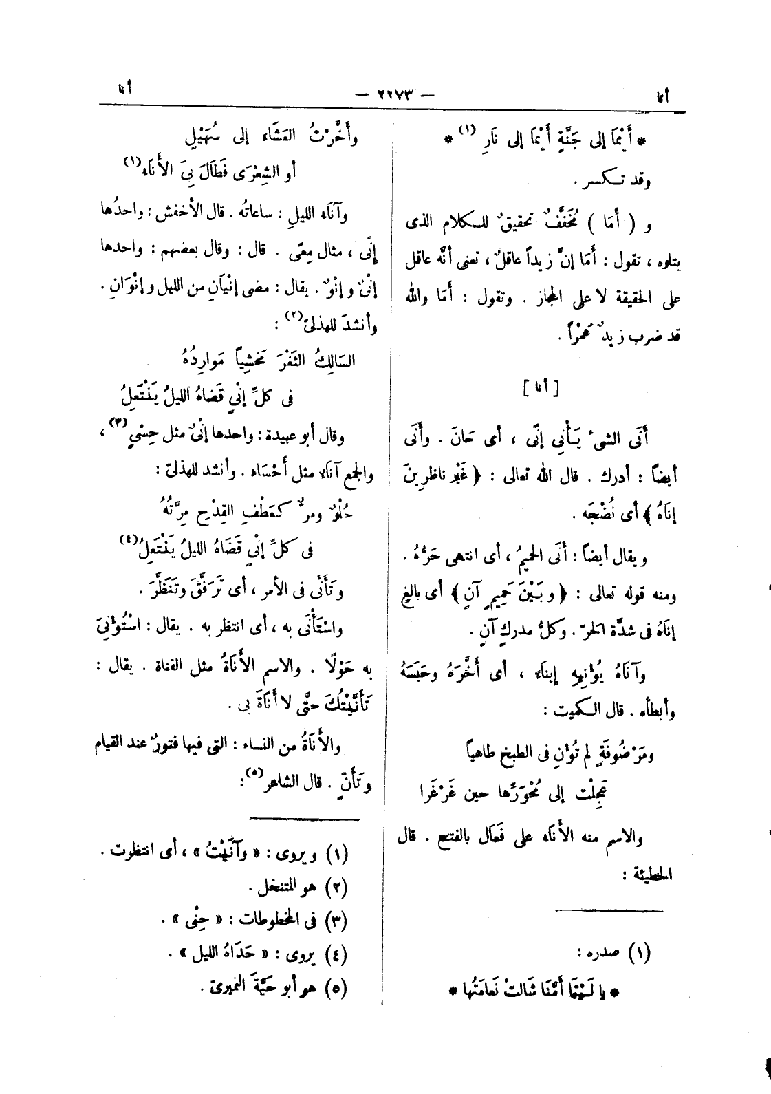 (*) وأَخَّرْتُ العَشاَء إلى سُهَيْلٍ * أو الشِعْرى فَطالَ بيَ الأَناءُ (¬1) وآناء الليلِ: ساعاتُه. قال الأخفش: واحدُها إنى، مثال معى. قال: وقال بعضهم: واحدها إنْيٌ وإنْوٌ. يقال: مضى إنْيانِ من الليل وإنْوان. وأنشدَ للهذليّ (¬2) : السالِكُ الثَغْرَ مَخشياً مَوارِدُهُ * في كلِّ إنْيٍ قَضاهُ الليلُ يَنْتَعِلُ وقال أبو عبيدة: واحدها إنْيٌ مثل حسى (¬3) ، والجمع آناء مثل أحساء. وأنشد للهذلى: حلو ومرٌّ كعَطْفِ القِدْحِ مِرَّتُهُ * في كلِّ إنْيٍ قَضاهُ الليلُ يَنْتَعِلُ (¬4) وتَأَنَّى في الأمر، أي تَرَفَّقَ وتنظر. واستأنى به، أي انتظر به. يقال: اسْتؤْنيَ به حَوْلاً. والاسم الاناة مثل الفناة. يقال: تأنيتك حتى لا أَناةَ بي. والأناةُ من النساء: التي فيها فتورٌ عند القيام وتأن. قال الشاعر (¬5)
