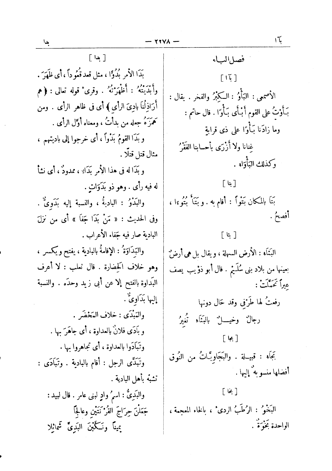 [بأا] الأصمعي: البَأْوُ: الكِبْرُ والفخر. يقال: بَأَوْتُ على القوم أَبْأَى بَأْواً. قال حاتم: وما زادَنا بَأْواً على ذي قرابةٍ * غِنانا ولا أَزْرى بأحسابنا الفَقْرُ وكذلك البأواء.