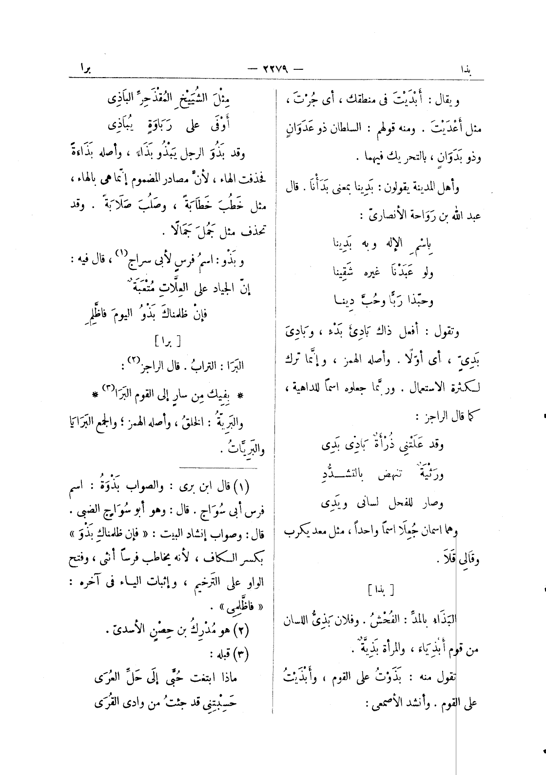 مثل الشييخ المقذحر الباذى * أوفى على رباوة يباذى وقد بَذوَ الرجل يَبْذو بَذاءً، وأصله بذاءة فحذفت الهاء، لان مصادر المضموم إنما هي بالهاء، مثل خطب خطابة، وصلب صلابة. وقد تحذف مثل جمل جمالا. وبذو: اسم فرس لابي سراج (¬1) ، قال فيه: إن الجياد على العلات متعبة * فإن ظلمناك بذو اليوم فاظلم