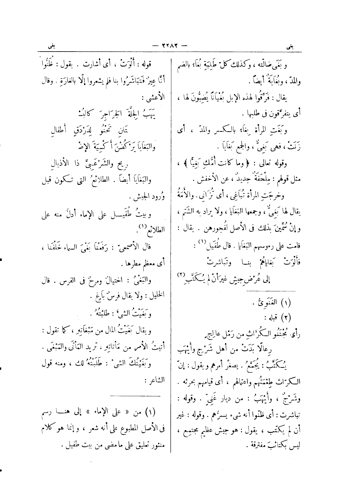 (*) قوله: ألوت، أي أشارت. يقول: ظنوا أنا عير فتباشروا بنا فلم يشعروا إلا بالغارة. وقال الاعشى: يهب الجِلَّةَ الجَراجِرَ كالبُسْ * تانِ تَحْنو لدردق أطفال والبغايا يركضن أكسية الاض * ريح والشرعبى ذا الاذيال والبغايا أيضاً. الطلائعُ التي تكون قبل ورود الجيش. وبيت طفيل على الاماء أدل منه على الطلائع (¬1) . قال الاصمعي: رفعنا بَغْيَ السماء خَلْفَنا، أي معظم مطرها. والبَغْيُ: اختيالٌ ومرحٌ في الفرس. قال الخليل: ولا يقال فرس باغ. ويغيت الشئ: طلبته. ويقال بَغَيْتُ المال من مَبْغاتِهِ، كما تقول: أتيتُ الأمر من مَأتاتِهِ، تريد المَأتَى والمَبْغى. وبَغَيْتُكَ الشئ: طلبته لك، ومنه قول الشاعر