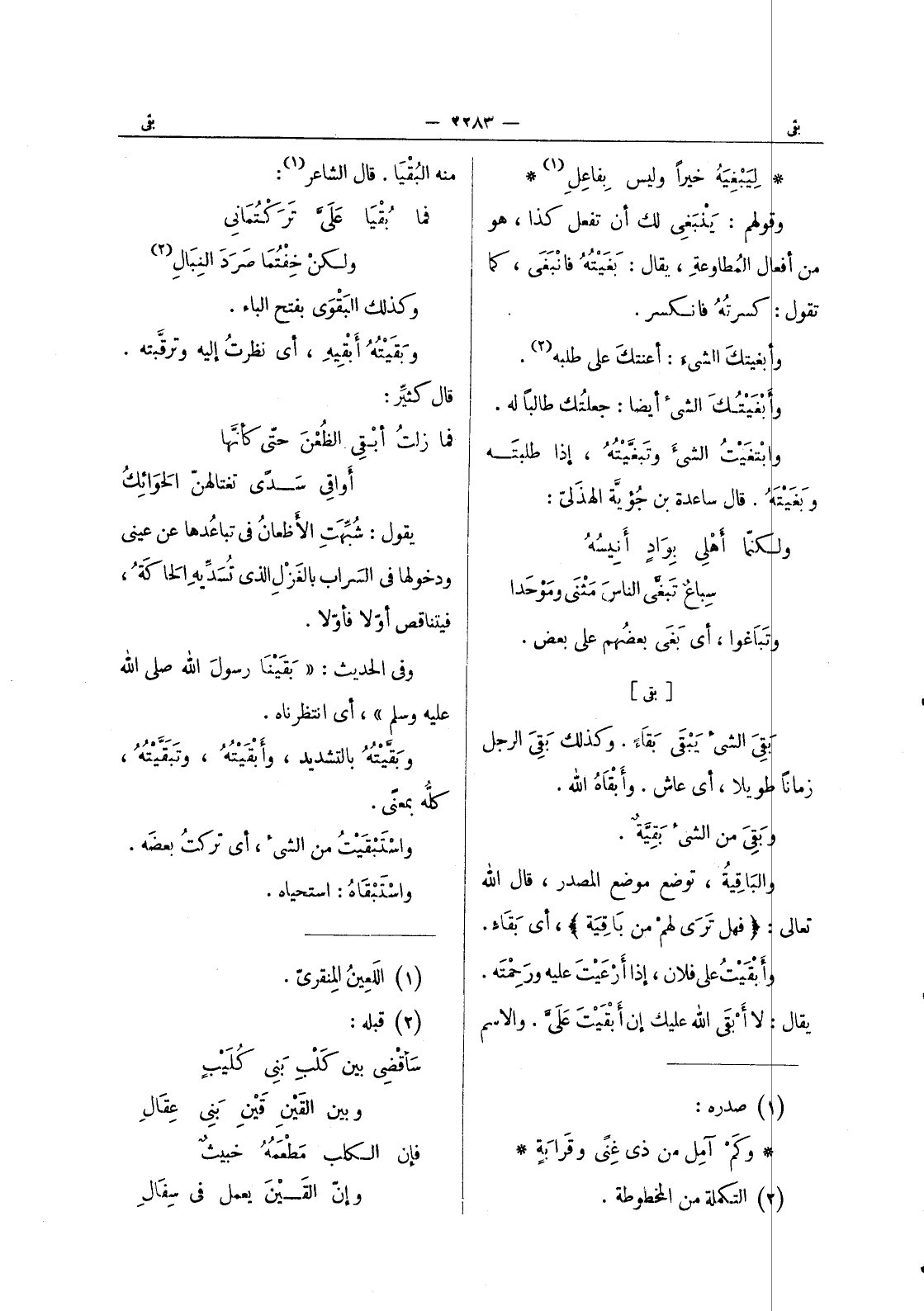 (*) منه البقيا. قال الشاعر (¬1) : فما بُقْيا عَلَيَّ تَرَكْتُماني * ولكنْ خِفْتُما صَرَدَ النِبالِ (¬2) وكذلك البَقْوى بفتح الباء. وبَقَيْتُهُ أَبْقيهِ، أي نظرتُ إليه وترقَّبته. قال كثير: فما زلت أبقى الظعن حتى كأنها * أواقى سدى تغتالهن الحوائك يقول: شبهت الاظعان في تباعدها عن عينى ودخولها في السراب بالغزل الذى تسديه الحاكة، فيتناقص أولا فأولا. وفي الحديث: " بَقَيْنا رسولَ الله صلى الله عليه وسلم "، أي انتظرناه. وبَقَّيْتُهُ بالتشديد، وأَبْقَيْتُهُ، وتَبَقَّيْتُهُ، كله بمعنى. واستبقيت من الشئ، أي تركتُ بعضَه. واسْتَبْقاهُ: استحياه.