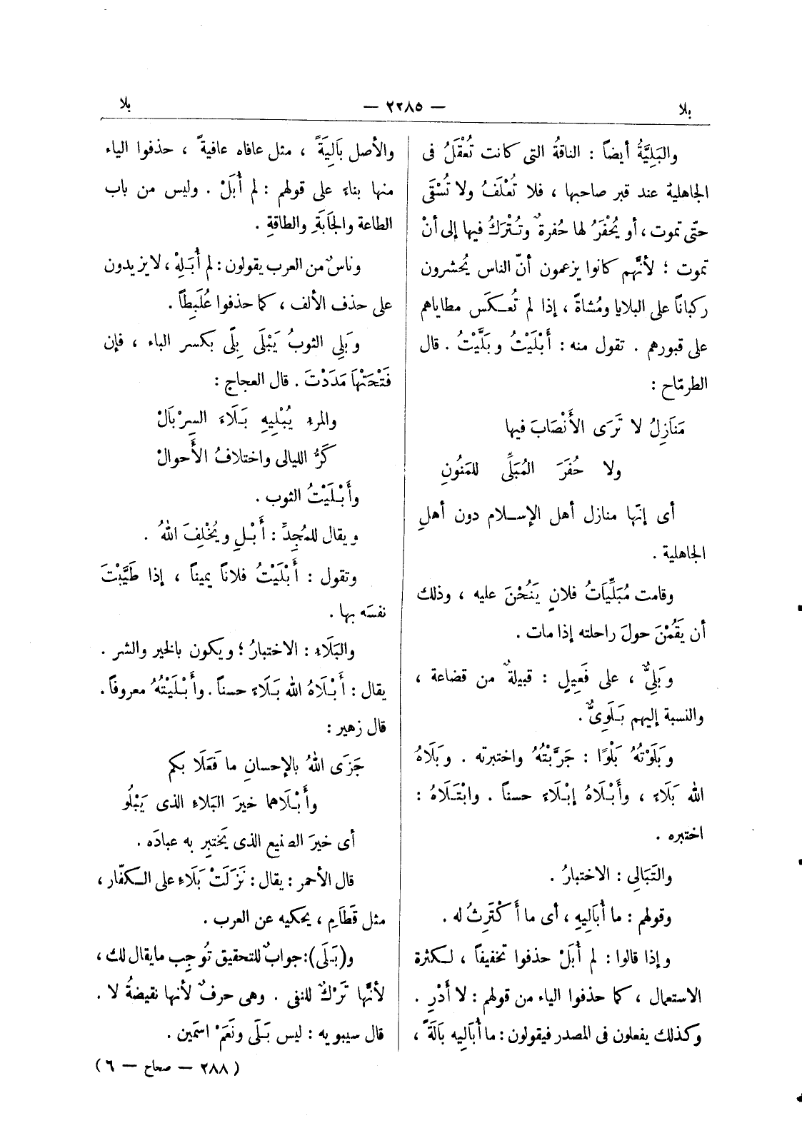 والاصل بالية، مثل عافاه عافية، حذفوا الياء منها بناء على قولهم: لم أبل. وليس من باب الطاعة والجابة والطاقة. وناس من العرب يقولون: لم أبله، لا يزيدون على حذف الالف، كما حذفوا علبطا. وبَلي الثوبُ يَبْلى بِلىً بكسر الباء، فإن فَتَحْتَها مَدَدْتَ. قال العجاج: والمرءُ يُبْليهِ بَلاَء السِرْبالْ * كَرُّ الليالي واختلافُ الأَحوالْ وأَبْلَيْتُ الثوب. ويقال للمُجِدَّ: أَبْلِ ويُخْلِفَ اللهُ. وتقول: أَبْلَيْتُ فلاناً يميناً، إذا طَيَّبْتَ نفسَه بها. والبَلاءُ: الاختبارُ ; ويكون بالخير والشر. يقال: أَبْلاهُ الله بَلاءً حسناً. وأَبْلَيْتُهُ معروفاً. قال زهير: جَزى اللهُ بالإحسانِ ما فَعَلا بكم * وأبْلاهما خيرَ البَلاَء الذي يَبْلُو أي خيرَ الصنيع الذي يَختبِر به عباده. قال الاحمر: يقال: نزلت بلاء على الكفار، مثل قطام، يحكيه عن العرب. و (بلى) : جواب للتحقيق توجب ما يقال لك، لانها ترك للنفي. وهى حرف لانها نقيضة لا. قال سيبويه: ليس بلى ونعم اسمين.