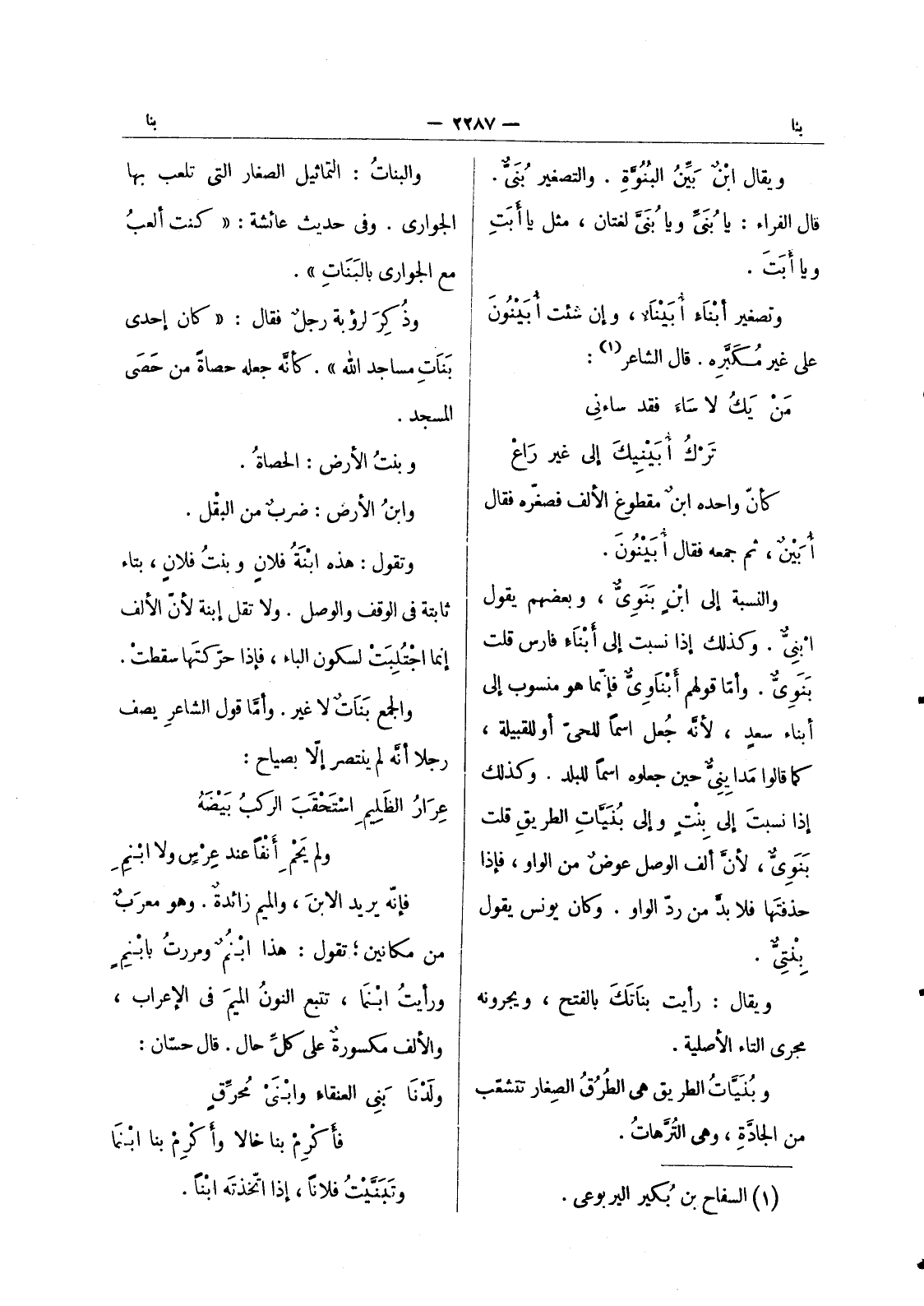 (*) والبنات: التماثيل الصغار التي تلعب بها الجواري. وفي حديث عائشة: " كنت ألعبُ مع الجوارى بالبنات ". وذكر لرؤبة رجل فقال: " كان إحدى بنات مساجد الله ". كأنه جعله حصاة من حصى المسجد. وبنت الارض: الحصاة. وابنُ الأرض: ضربٌ من البقْل. وتقول: هذه ابْنَةُ فلانٍ وبنتُ فلانٍ، بتاء ثابتة في الوقف والوصل. ولا تقل إبنة لان الالف إنما اجتلبت لسكون الباء، فإذا حركتها سقطت. والجمع بنات لا غير. وأما قول الشاعر يصف رجلا أنه لم ينتصر إلا بصياح: عرار الظلم استحقب الركب بيضة * ولم يحم أنفا عند عرس ولا ابنم فإنه يريد الابن، والميم زائدة. وهو معرب من مكانين ; تقول: هذا ابْنُمٌ ومررتٌ بابْنِمٍ ورأيتُ ابْنماً، تتبع النونُ الميمَ في الإعراب، والألف مكسورةٌ على كلِّ حال. قال حسّان: ولَدْنا بَني العنقاء وابْنَيْ مُحرِّقٍ * فأَكْرِمْ بنا خالاً وأَكْرِمْ بنا ابْنما وتَبَنَّيْتُ فلاناً، إذا اتّخذتَه ابْناً.