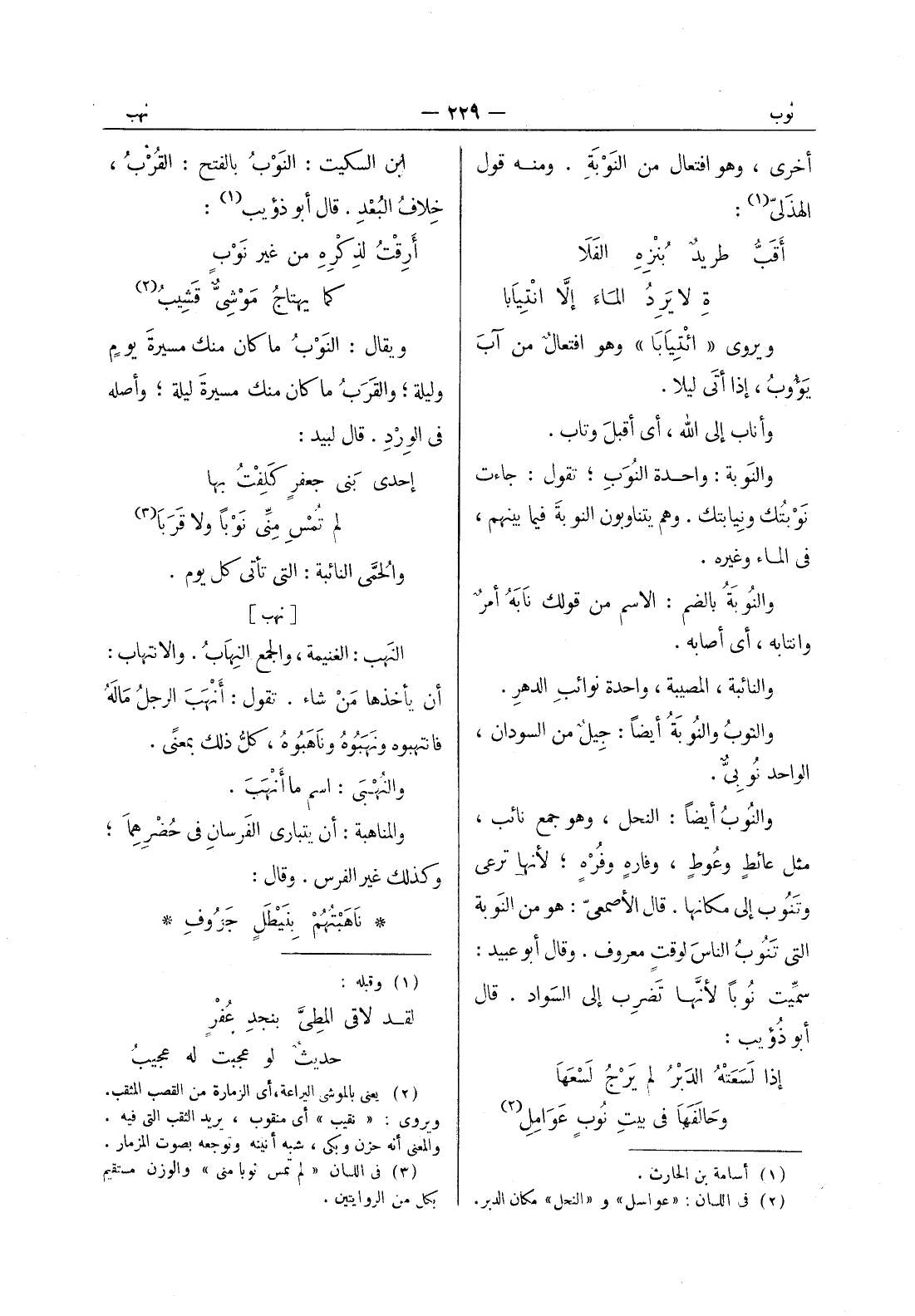أخرى، وهو افتعال من النوبة. ومنه قول الهذلى (¬1) : أقَبَّ طريدٍ بنَزْهِ الفلا * ةِ لا يَرِدُ الماَء إلا انْتيابا وريوى " ائتيابا " وهو افعتال من آب يؤوب، إذا أتى ليلا. وأناب إلى الله، أي أقبل وتاب. والنَوبة: واحدة النُوَبِ، تقول: جاءت نَوْبتُك ونِيابتك. وهم يتناوبون النوبةَ فيما بينهم، في الماء وغيره. والنُوبَةُ بالضم: الاسم من قولك نابَهُ أمرٌ وانتابه، أي أصابه. والنائبة، المصيبة، واحدة نوائبِ الدهر. والنوبُ والنوبة أيضا: جيل من السودان، الواحد نوبى. والنوب أيضا: النحل، وهو جمع نائب، مثل غائط وعوط، وفاره وفره، لانها ترعى وتنوب إلى مكانها. قال الاصمعي: هو من النوبة التى تنوب الناس لوقت معروف. وقال أبو عبيد: سميت نوبا لانها تضرب إلى السواد. قال أبو ذؤيب: إذا لسعته الدبر لم يرج لسعها * وحالفها في بيت نوب عوامل (¬2)