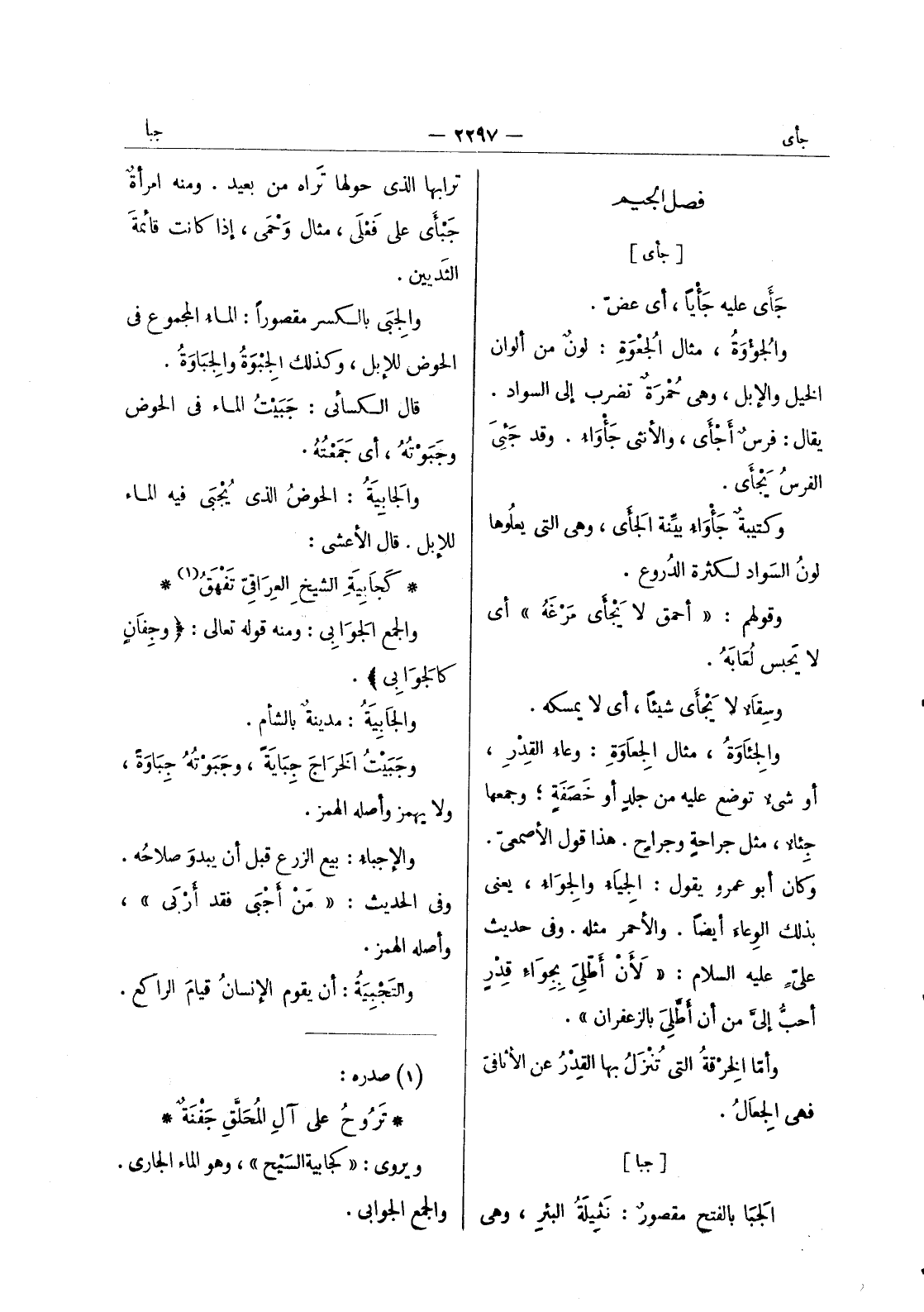 كَجابِيَةِ الشيخِ العِراقي تَفْهَقُ (¬1) * والجمع الجَوابي: ومنه قوله تعالى: (وجفان كالجوابى) . والجابية: مدينة بالشأم. وجبيت الخراج جباية، وجبوته جباوة، ولا يهمز وأصله الهمز. والاجباء: بيع الزرع قبل أن يبدوَ صلاحُه. وفي الحديث: " مَنْ أَجْبى فقد أربى "، وأصله الهمز. والتجبية: أن يقوم الانسان قيام الراكع.