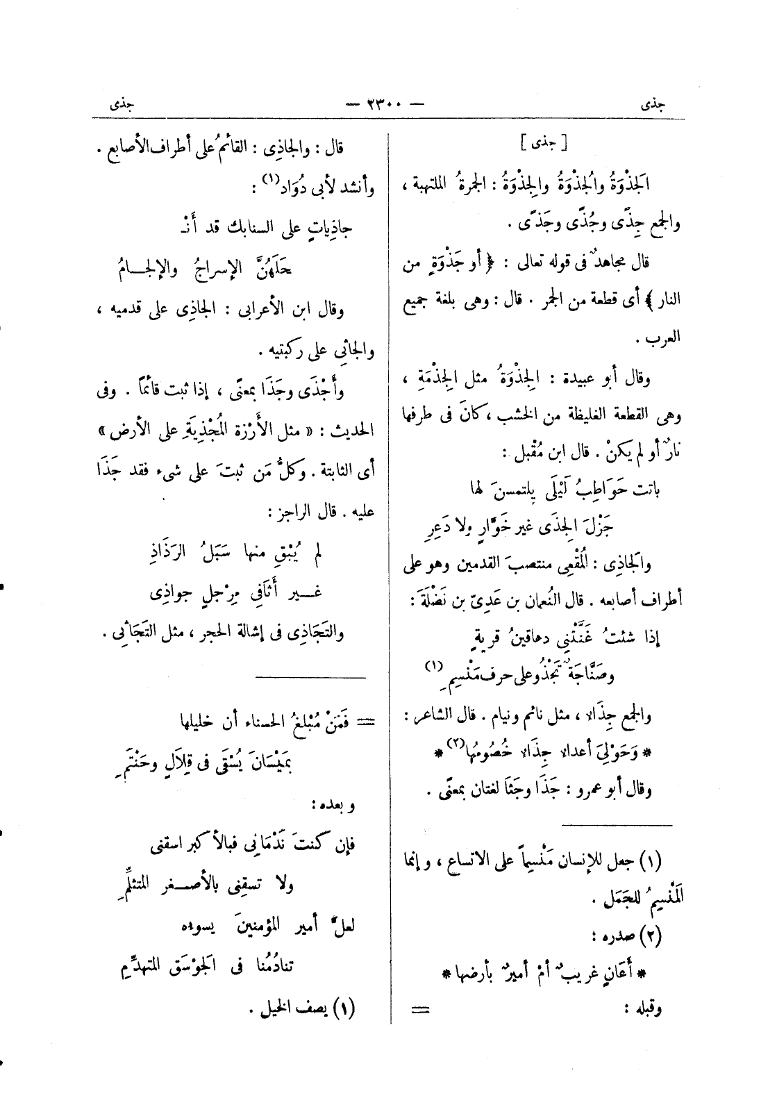 [جذى] الجَذْوَةُ والجُذْوَةُ والجِذْوَةُ: الجمرةُ الملتهبة، والجمع جِذىً وجُذىً وجَذىً. قال مجاهدٌ في قوله تعالى: (أو جَذْوَةٍ من النار) أي قطعة من الجمر. قال: وهي بلغة جميع العرب. وقال أبو عبيدة: الجِذْوَةُ مثل الجِذْمَةِ، وهي القطعة الغليظة من الخشب، كانَ في طرفها نارٌ أو لم يكنْ. قال ابن مُقْبل: باتت حَواطِبُ لَيْلى يلتمسنَ لها * جِزْلَ الجِذى غير خَوَّارٍ ولا دَعِرِ والجاذي: المُقْعي منتصبَ القدمين وهو على أطراف أصابعه. قال النُعمان بن عَديّ بن نَضْلَةَ: إذا شئتُ غَنَّتْني دهاقينُ قريةٍ * وصَنَّاجَةٌ تَجْذو على حرف مَنْسِم (¬1) والجمع جذاء، مثل نائم ونيام. قال الشاعر: