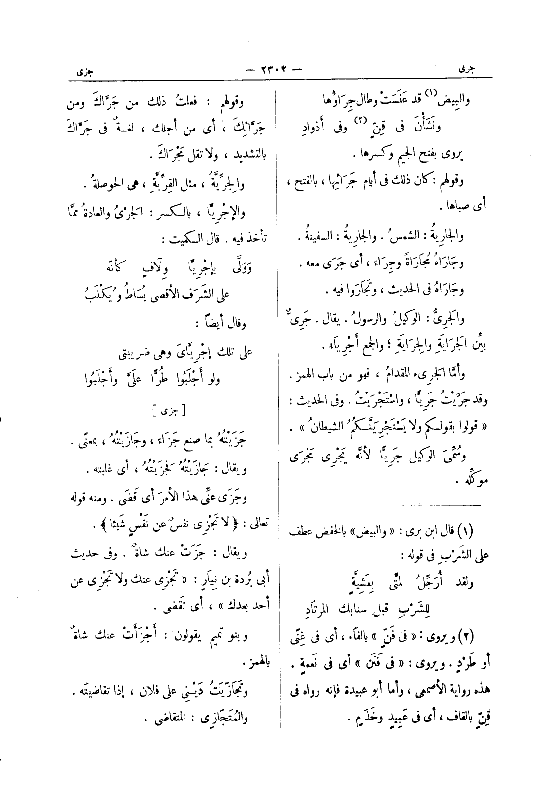 والبيضُ (¬1) قد عَنَسَتْ وطال جِراؤُها * ونشأن في قن (¬2) وفى أذواد يروى بفتح الجيم وكسرها. وقولهم: كان ذلك في أيام جَرائِها، بالفتح، أي صباها. والجارِيةُ: الشمسُ. والجاريةُ: السفينةُ. وجاراهُ مُجاراةً وجِراءً، أي جَرى معه. وجاراهُ في الحديث، وتَجارَوا فيه. والجَريُّ: الوكيلُ والرسولُ. يقال. جَريٌّ بيِّن الجَرايَةِ والجِرايَةِ ; والجمع أجرياء. وأما الجرئ المقدام، فهو من باب الهمز. وقد جريت جريا، واستجريت. وفى الحديث: " قولوا بقولكم ولا يستجرينكم الشيطان ". وسمى الوكيل جريا لانه يجرى مجرى موكله.
