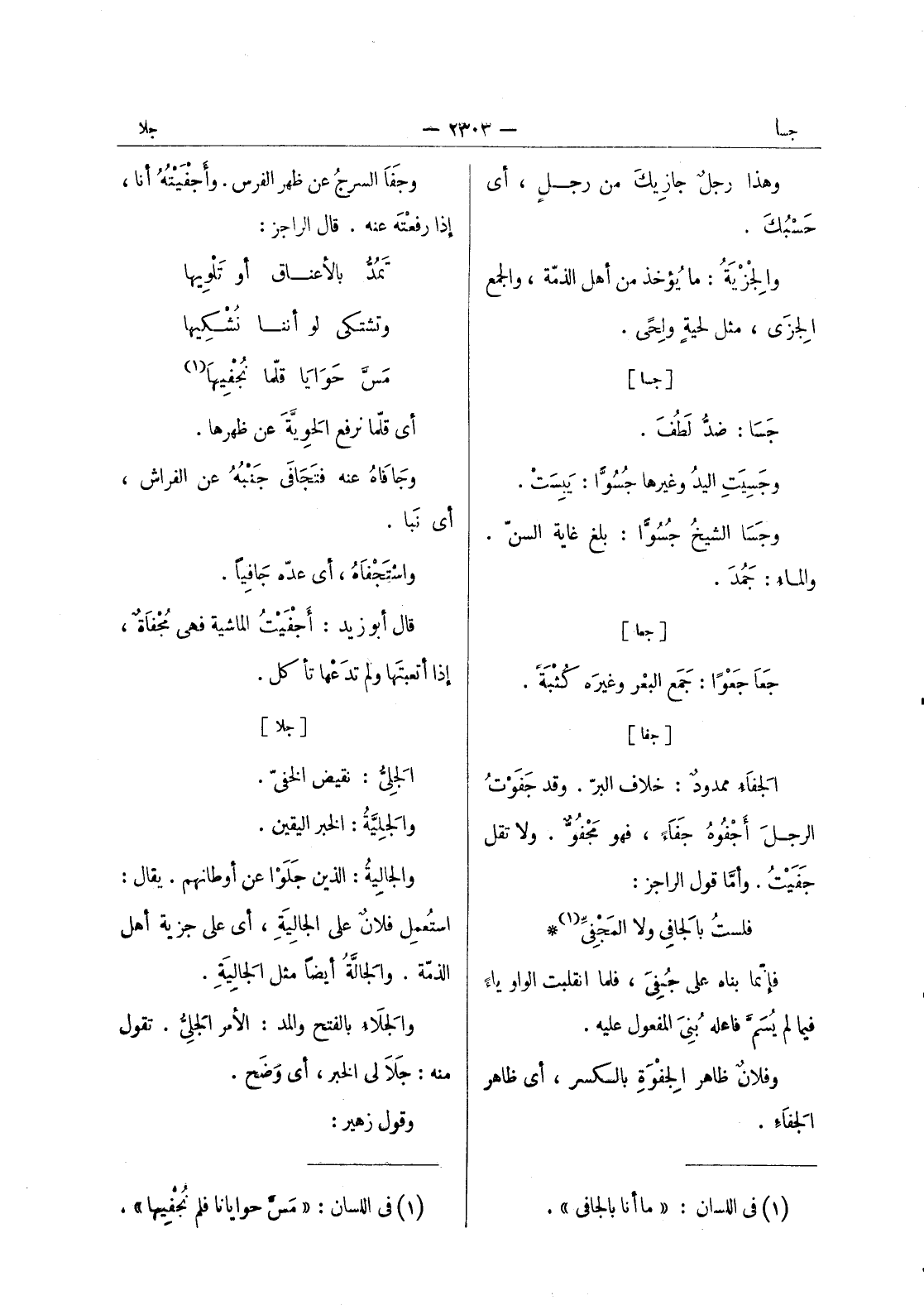 (*) وجفا السرجُ عن ظهر الفرس. وأَجْفَيْتُهُ أنا، إذا رفعته عنه. قال الراجز: تمد بالاعناق أو تَلْويَها * وتَشْتَكي لو أَنَّنا نشكيها مس حوايا قلما نجفيها (¬1) * أي قلما نرفع الحوية عن ظهرها. وجافاه عنه فتَجافى جَنْبُهُ عن الفراش، أي نَبا. واسْتَجْفاهُ، أي عدّه جافِياً. قال أبو زيد: أَجْفَيْتُ الماشية فهي مُجْفاةٌ، إذا أتعبتَها ولم تدعها تأكل.