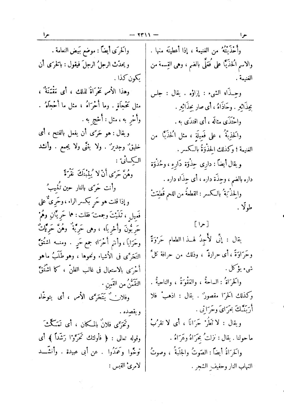 [حرا] يقال: إنِّي لأَجِدُ لهذا الطعام حَرْوَةً وحَراوَةً، أي حرارةً، وذلك من حرافة كل شئ يؤكل. والحَراةُ: الساحةُ، والعَقْوَةُ، والناحيةُ. وكذلك الحَرا مقصورٌ. يقال: اذهبْ فلا أَرَيَنَّكَ بحَرايَ وحَراتي. ويقال: لا تَطُرْ حَرانا، أي لا تقرب محولنا. يقال: نزلت بحراه وعَراةُ. والحَراةُ أيضاً: الصَوتُ والجلَبةُ، وصوتُ التهاب النار وحفيف الشجر.