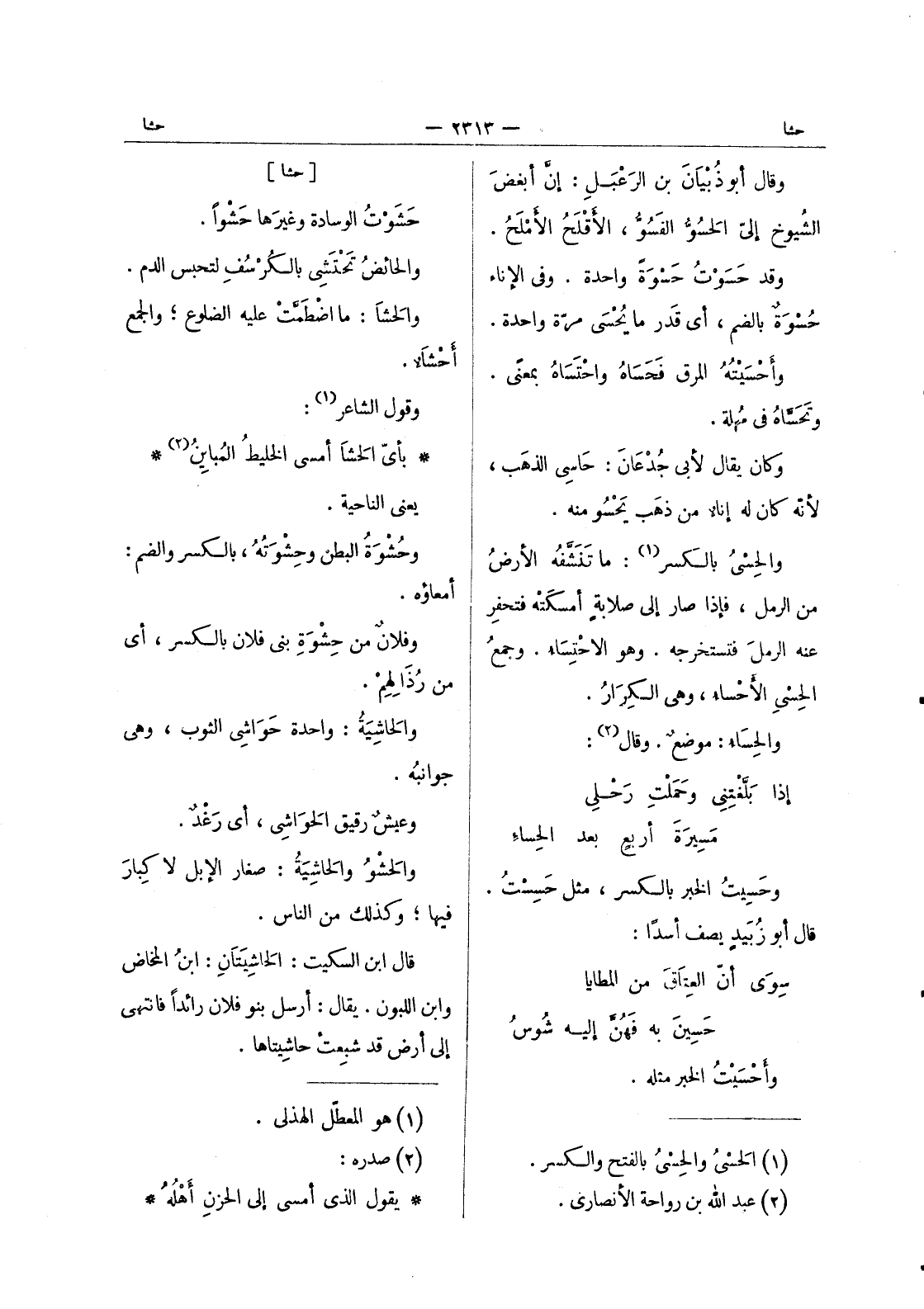 بأى الحشا أمسى الخليط المباين (¬2) * يعنى الناحية. وحشوة البطن وحشوته، بالكسر والضم: أمعاؤه. وفلان من حشوة بنى فلان بالكسر، أي من رذالهم. والحاشية: واحدة حواشى الثوب، وهى جوانبه. وعيش رقيق الحواشى، أي رغد. والحشو والحاشية: صغار الابل لا كبار فيها، وكذلك من الناس. قال ابن السكيت: الحاشيتان: ابن المخاض وابن اللبون. يقال: أرسل بنو فلان رائدا فانتهى إلى أرض قد شبعت حاشيتاها.