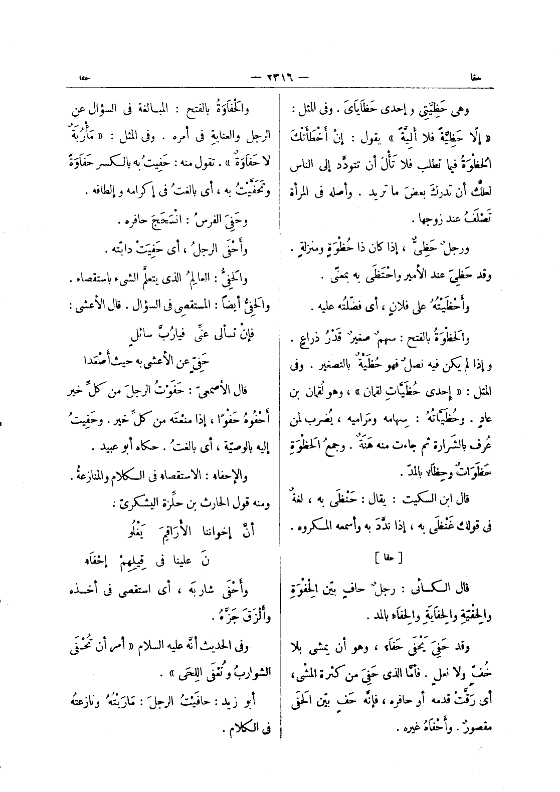 [حفا] قال الكسائي: رجلٌ حافٍ بيّن الحِفْوَةِ والحِفْيَةِ والحِفايَةِ والحِفاءِ بالمد. وقد حَفِيَ يَحْفى حَفاءً، وهو أن يمشي بلا خُف ولا نعلٍ، فأمَّا الذي حَفِيَ من كثرة المشْي، أي رَقَّتْ قدمه أو حافره، فإنه حَفٍ بيّن الحَفى مقصورٌ. وأَحْفاهُ غيره.