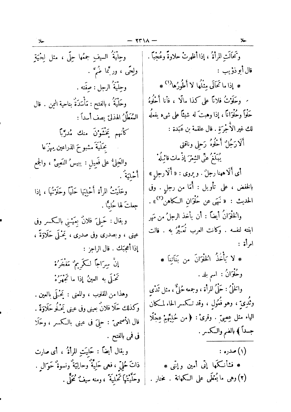 (*) وحلية السيف جمعها حلى، مثل لحية ولحى، وربما ضم. وحلية الرجل: صفته. وحلية، بالفتح: مأسدة بناحية اليمن. قال المعطل الهذلى يصف أسدا: كأنهم يخشون منك مدربا * بحلية مشبوح الذراعين مهزعا والحلى على فعيل: يبيسُ النَصيِّ، والجمع أَحْلِيَةٌ. وحَلَيْتُ المرأة أَحْلِيَها حَلْياً وحَلَوْتُها، إذا جعلتَ لها حُلِيَّاً. ويقال: حَلِيَ فلانٌ بِعَيْني بالكسر وفي عيني، وبصدري وفي صدري، يَحْلى حَلاوَةً، إذا أعجبَك. قال الراجز: إنَّ سراجاً لكَرِيمٌ مَفْخَرُة * تَحْلى به العينُ إذا ما تَجْهَرُهْ وهذا من المقلوب، والمعنى: يَحْلى بالعين. وكذلك حَلا فلانٌ بعيني وفي عيني يَحْلُو حَلاوَةً. قال الأصمعيّ: حلِيَ في عيني بالكسر، وحَلا في فمي بالفتح. ويقال أيضاً: حَلِيَتِ المرأةُ، أي صارت ذاتَ حُليٍّ، فهي حَلِيَّةٌ وحالِيَةٌ ونسوةٌ حَوالٍ. وحَلَّيْتُها تَحْلِيَةً، ومنه سيفٌ محلى.