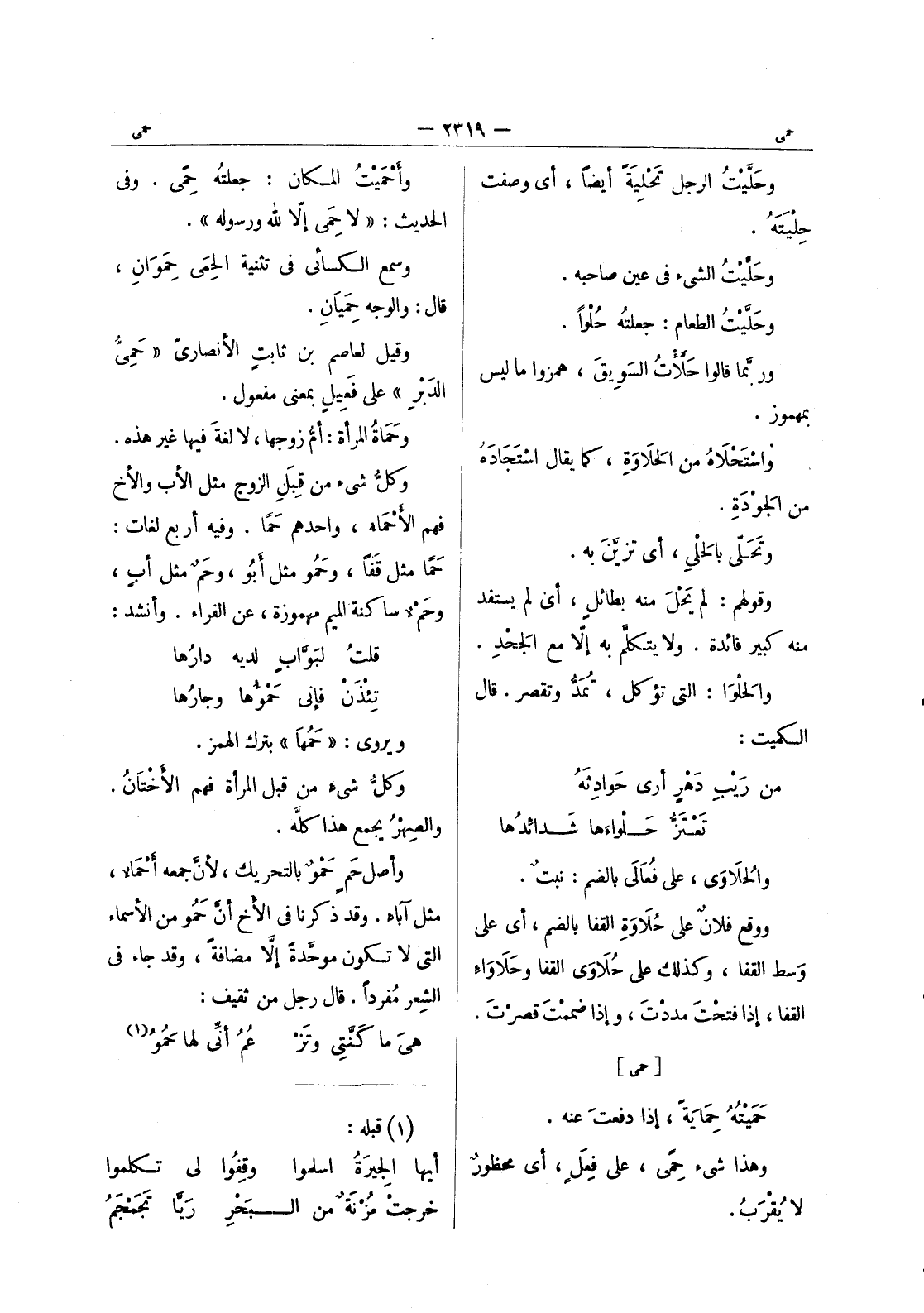 وحليت الرجل تحلية أيضا، أي وصفت حليته. وحليت الشئ في عين صاحبه. وحليت الطعام: جعلته حلوا. وربما قالوا حلات السويق، همزوا ما ليس بمهموز. واستحلاه من الحلاوة، كما يقال استجاده من الجودة. وتحلى بالحلى، أي تزيَّنَ به. وقولهم: لم يَحْلَ منه بطائِلٍ، أي لم يستفد منه كبير فائدة. ولا يتكلَّمُ به إلاّ مع الجَحْدِ. والحلوا: التى تؤكل، تُمَدُّ وتقصر. قال الكميت: من رَيْبِ دَهْرٍ أرى حَوادِثَهُ * تَعْتَزُّ حَلْواءها شَدائدُها والحُلاوى، على فعالى بالضم: نبت. ووقع فلان على حلاوة القفا بالضم، أي على وسط القفا، وكذلك على حُلاوى القفا وحَلاواءِ القفا، إذا فتحْتَ مددْتَ، وإذا ضممت قصرت.