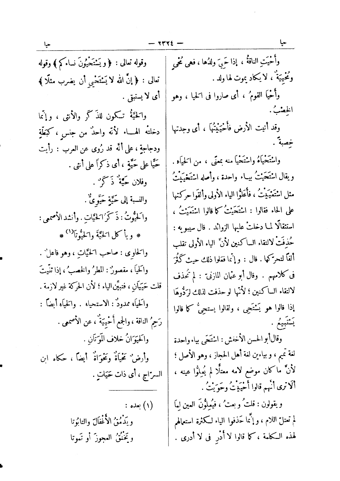 وقوله تعالى: (ويَسْتَحيونَ نساءكم) وقوله تعالى: (إنَّ الله لا يَسْتَحْيي أن يضرب مثلاً) أي لا يستبقي. والحَيَّةُ تكون للذَكَر والأنثى، وإنّما دخلتْه الهاء لأنّه واحد ٌمن جنسٍ، كبَطّةٍ ودجاجةٍ، على أنَّه قد رُوي عن العرب: رأيت حَيَّا على حَيَّةٍ، أي ذكراً على أنثى. وفلان حَيَّةٌ ذَكَرٌ. والنسبة إلى حَيَّةٍ حَيَّويٌّ. والحَيُّوتُ: ذَكَرُ الحَيَّاتِ. وأنشد الأصمعي: