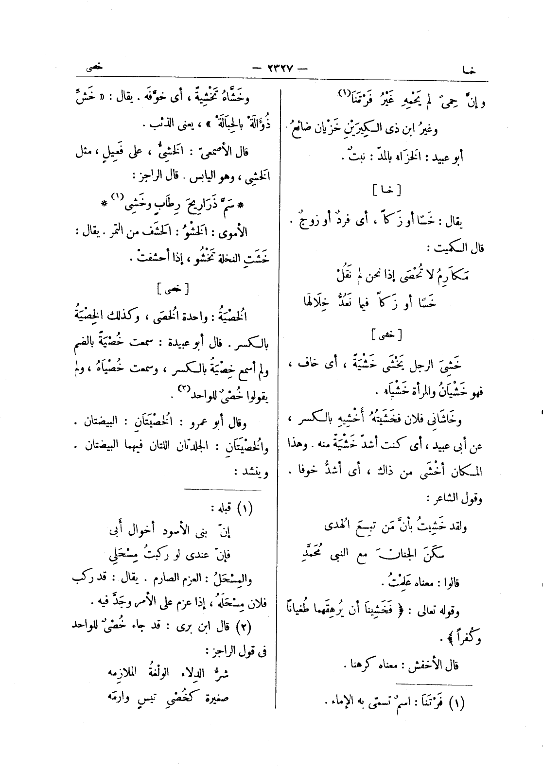 [خشى] خَشيَ الرجل يَخْشَى خَشْيَةً، أي خاف، فهو خَشْيانُ والمرأة خَشْيَاءُ. وخاشاني فلان فخَشَيتُهُ أَخْشيهِ بالكسر، عن أبي عبيد، أي كنت أشدّ خَشْيَةً منه. وهذا المكان أَخْشَى من ذاك، أي أشدُّ خوفاً. وقول الشاعر: ولقد خَشيتُ بأنَّ مَن تبِعَ الهُدى * سكَنَ الجنانَ مع النبي مُحَمَّدِ قالوا: معناه عَلِمْتُ. وقوله تعالى: (فَخَشينا أن يُرهِقَهما طُغياناً وكُفراً) . قال الاخفش: معناه كرهنا.