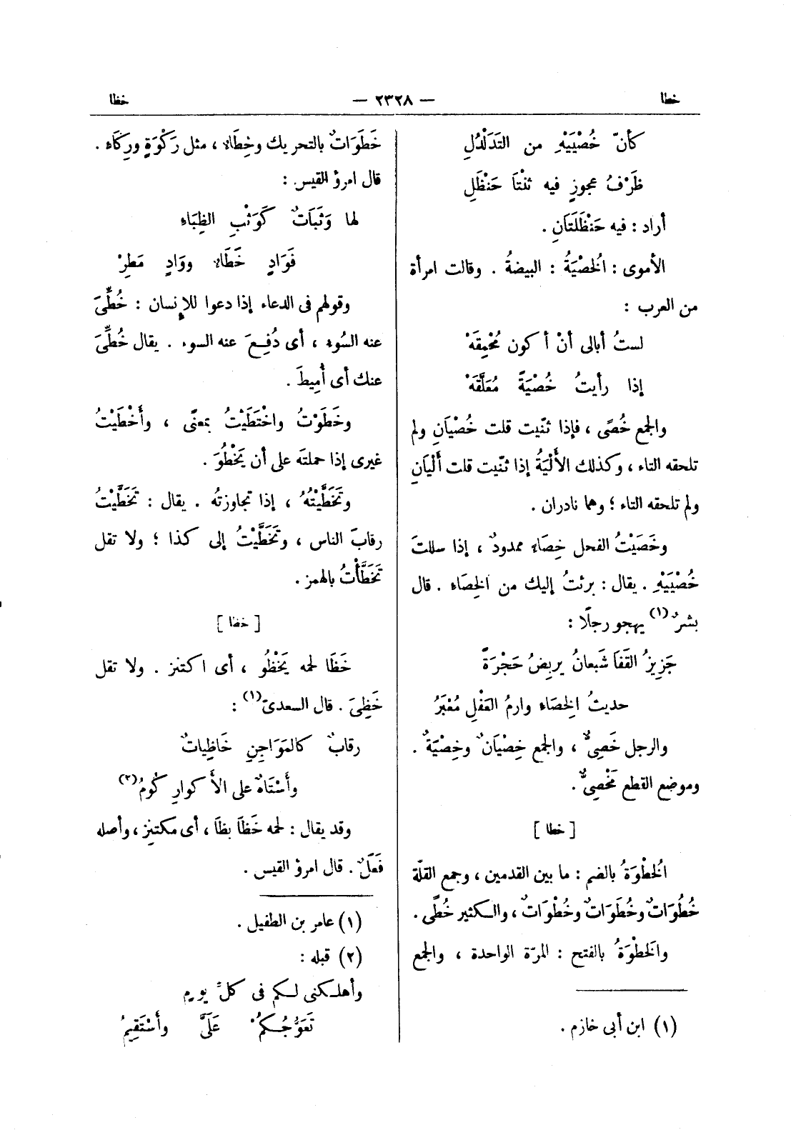 (*) خطوات بالتحريك وخطاء، مثل ركوة وركاء. قال امرؤ القيس: لها وَثباتٌ كَوَثبِ الظِباءِ * فَوادٍ خَطاءٌ ووادٍ مَطِرْ وقولهم في الدعاء إذا دعوا للإنسان: خُطِّيَ عنه السُوءُ، أي دُفِعَ عنه السوء. يقال خطى عنك أي أميط. وخَطَوْتُ واخْتَطَيْتُ بمعنىً، وأَخْطَيْتُ غيري إذا حملتَه على أن يَخْطُوَ. وتَخَطَيْتُهُ، إذا تجاوزتُه. يقال: تَخَطَّيْتُ رقاب الناس، وتَخَطَّيْتُ إلى كذا ; ولا تقل تخطأت بالهمز.