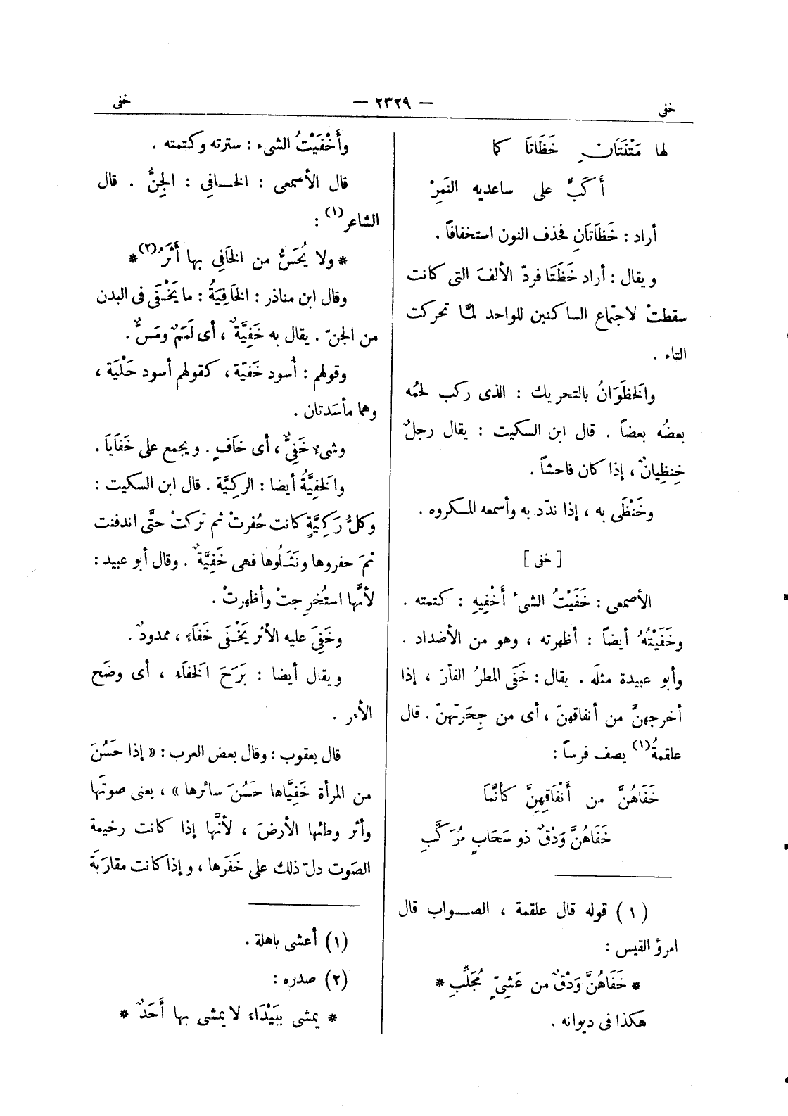 ولا يُحسُّ من الخافي بها أَثَرُ (¬2) * وقال ابن مناذر: الخافِيَةُ: ما يَخْفى في البدن من الجنّ. يقال به خَفِيَّةٌ، أي لَمَمٌ ومس. وقولهم: أسود خفية، كقولهم أسود حلية، وهما مأسدتان. وشئ خفى، أي خاف. ويجمع على خَفايا. والخَفيَّةُ أيضاً: الركِيَّة. قال ابن السكيت: وكلُّ رَكِيَّةٍ كانت حُفرت ثم تركتْ حتّى اندفنت ثمّ حفروها ونَثَلوها فهي خَفِيَّةٌ. وقال أبو عبيد: لأنَّها استُخرِجتْ وأظهرتْ. وخَفَى عليه الأثر يَخْفى خَفاءً، ممدودٌ. ويقال أيضاً: بَرَحَ الخَفاءُ، أي وضَح الامر. قال يعقوب: وقال بعض العرب: " إذا حسن من المرأة خفياها حسن سائرها "، يعنى صوتها وأثر وطئها الارض، لانها إذا كانت رخيمة الصوت دل ذلك على خفرها، وإذا كانت مقاربة