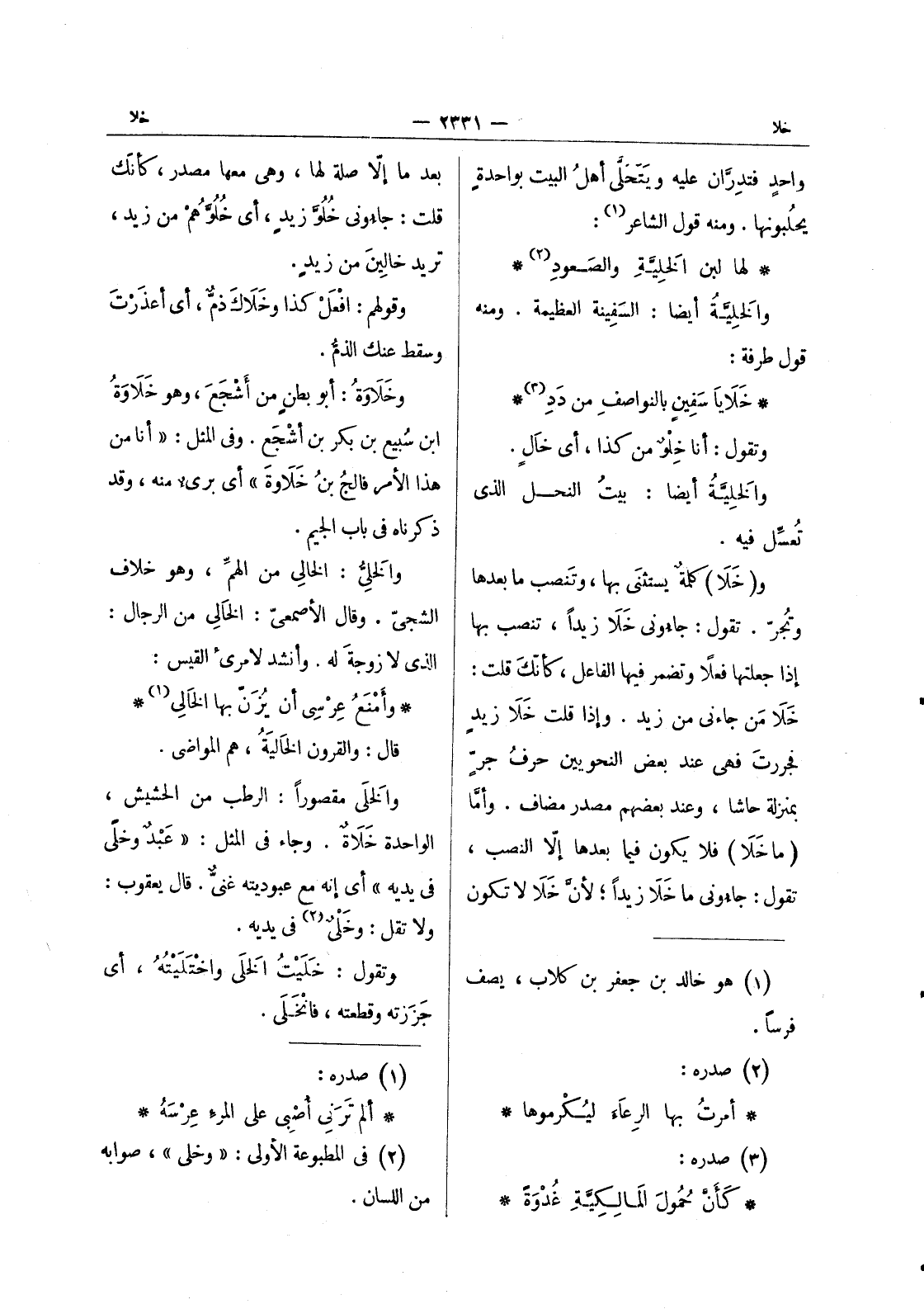 (*) بعد ما إلا صلة لها، وهي معها مصدر، كأنّك قلت: جاءُوني خُلُوَّ زيدٍ، أي خُلُوَّهُمْ من زيد، تريد خالِينَ من زيدٍ. وقولهم: افْعَلْ كذا وخَلاكَ ذمٌّ، أي أعذَرْتَ وسقط عنك الذم. وخلاوة: أبو بطن من أشجع، وهو خلاوة ابن سبيع بن بكر بن أشجع. وفى المثل: " أنا من هذا الامر فالج بن خلاوة " أي برئ منه، وقد ذكرناه في باب الجيم. والخلى: الخالى من الهم، وهو خلاف الشجيّ. وقال الأصمعيّ: الخَالي من الرجال: الذي لا زوجةَ له. وأنشد لامرئ القيس: